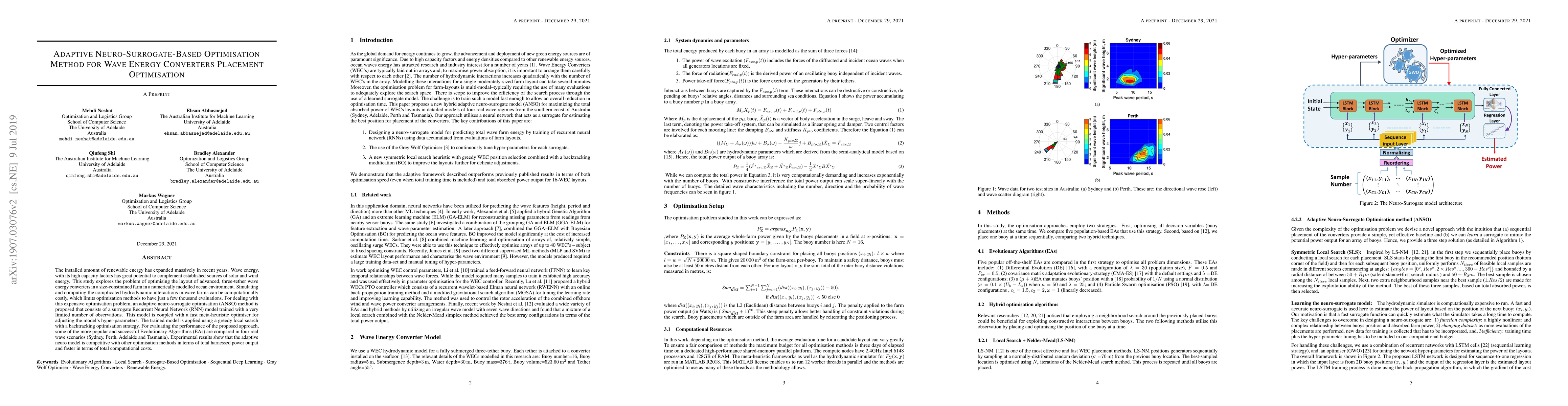This paper proposes an adaptive neuro-surrogate optimisation method for optimising the placement of wave energy converters in a constrained farm, using a surrogate Recurrent Neural Network trained with limited observations. The method is shown to be competitive with Evolutionary Algorithms in maximising harnessed power while significantly reducing computational costs.