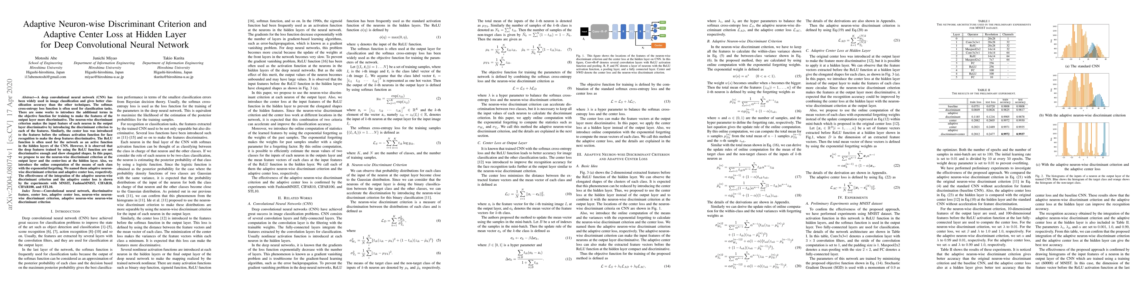 This paper proposes an adaptive neuron-wise discriminant criterion at the output layer and an adaptive center loss at the hidden layer for deep convolutional neural networks to improve feature discrimination. Experiments on multiple datasets demonstrate the effectiveness of the proposed losses.
