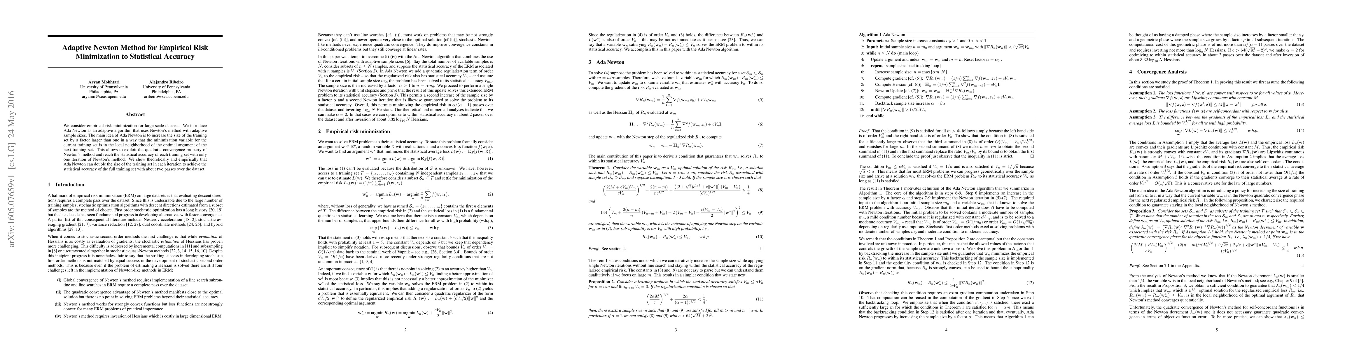 The paper introduces Ada Newton, an adaptive algorithm for empirical risk minimization that leverages Newton's method with adaptive sample sizes to achieve statistical accuracy. Ada Newton doubles the training set size per iteration, allowing for quadratic convergence and reaching full statistical accuracy in just two passes over the dataset.