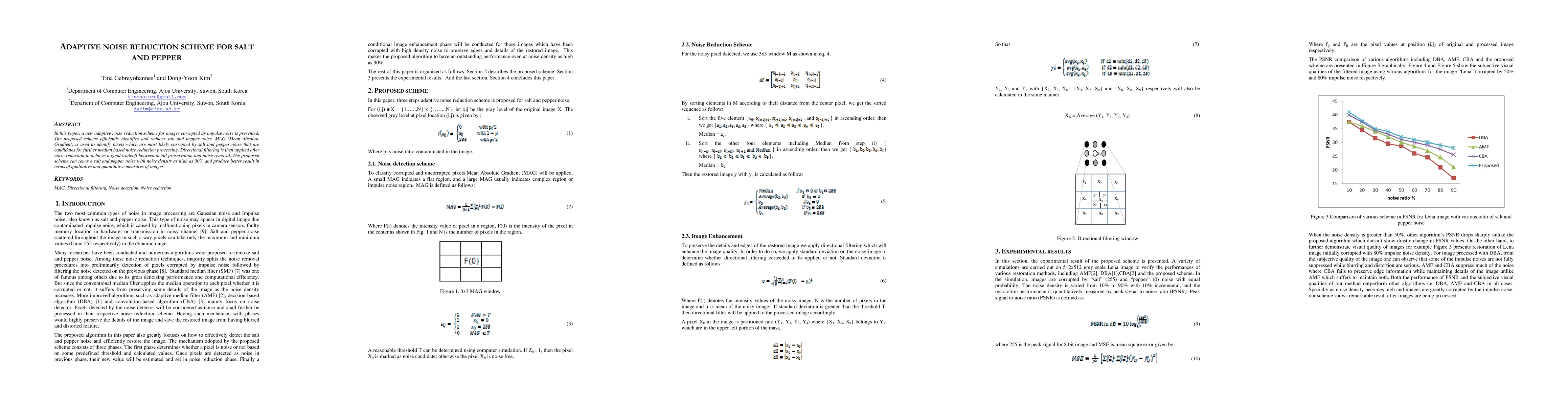 This paper introduces an adaptive noise reduction scheme that effectively identifies and reduces salt and pepper noise in images using MAG for initial noise detection, followed by median-based processing and directional filtering to balance detail preservation and noise removal, achieving high noise density reduction.