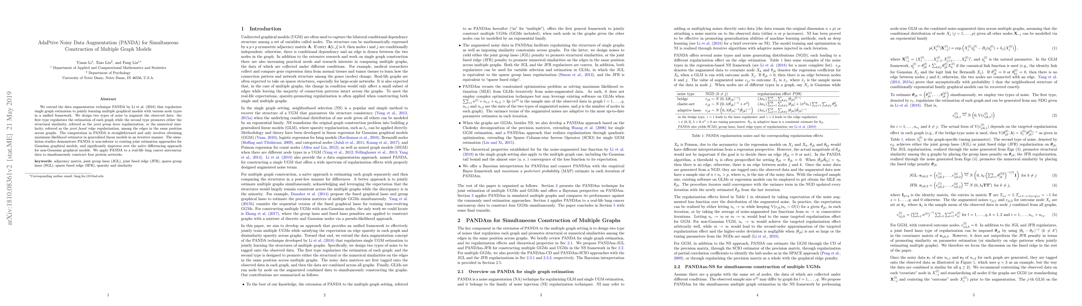 This paper proposes AdaPtive Noisy Data Augmentation (PANDA) for constructing multiple graph models simultaneously, introducing noise to regularize individual graphs and promote similarity across graphs. PANDA outperforms existing methods in both Gaussian and non-Gaussian graphical models and is applied to lung cancer data to build four protein networks.