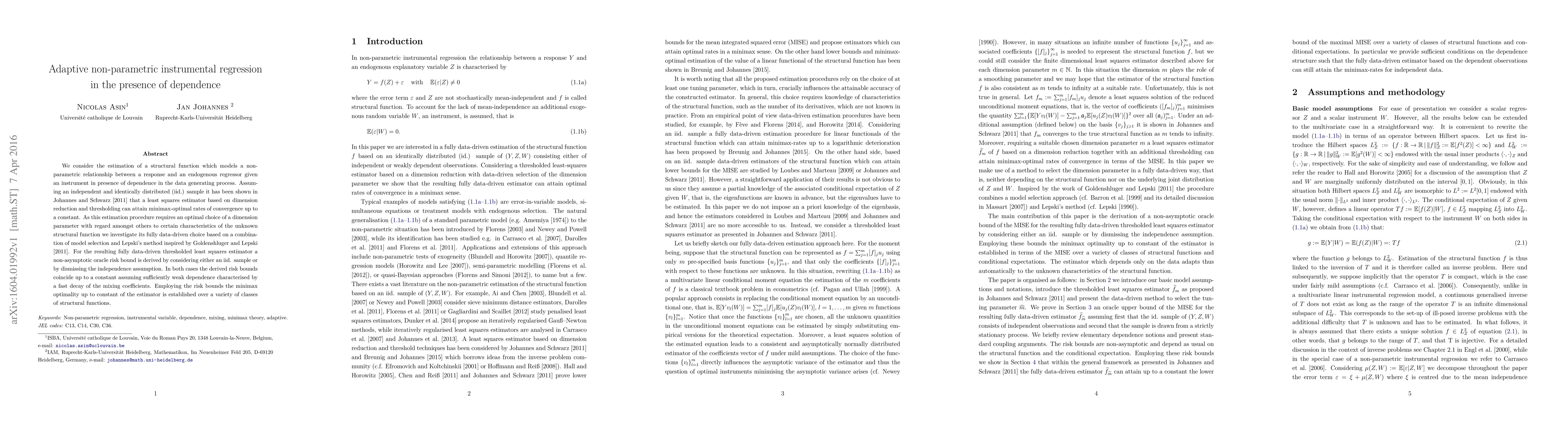 This paper develops a fully data-driven adaptive non-parametric instrumental regression method for estimating a structural function in the presence of dependence. It establishes minimax optimality of the proposed estimator under weak dependence conditions, leveraging model selection and Lepski's method.