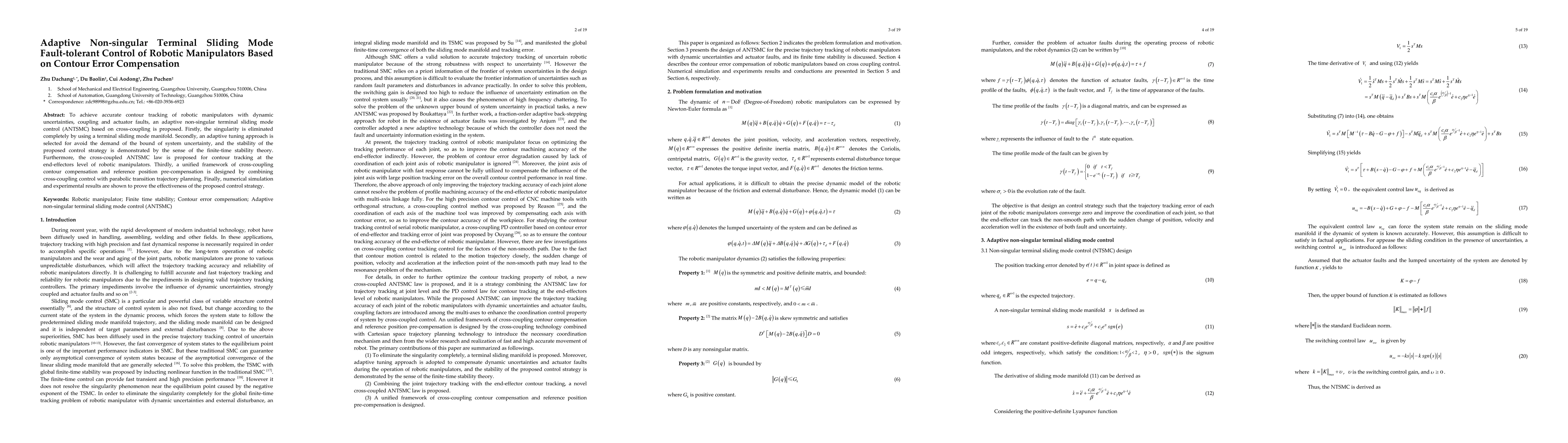 To achieve accurate contour tracking of robotic manipulators with dynamic uncertainties, coupling and actuator faults, an adaptive non-singular terminal sliding mode control (ANTSMC) based on cross-coupling is proposed. Firstly, the singularity is eliminated completely by using a terminal sliding mode manifold. Secondly, an adaptive tuning approach is selected for avoid the demand of the bound of system uncertainty, and the stability of the proposed control strategy is demonstrated by the sense of the finite-time stability theory. Furthermore, the cross-coupled ANTSMC law is proposed for contour tracking at the end-effectors level of robotic manipulators. Thirdly, a unified framework of cross-coupling contour compensation and reference position pre-compensation is designed by combining cross-coupling control with parabolic transition trajectory planning. Finally, numerical simulation and experimental results are shown to prove the effectiveness of the proposed control strategy.