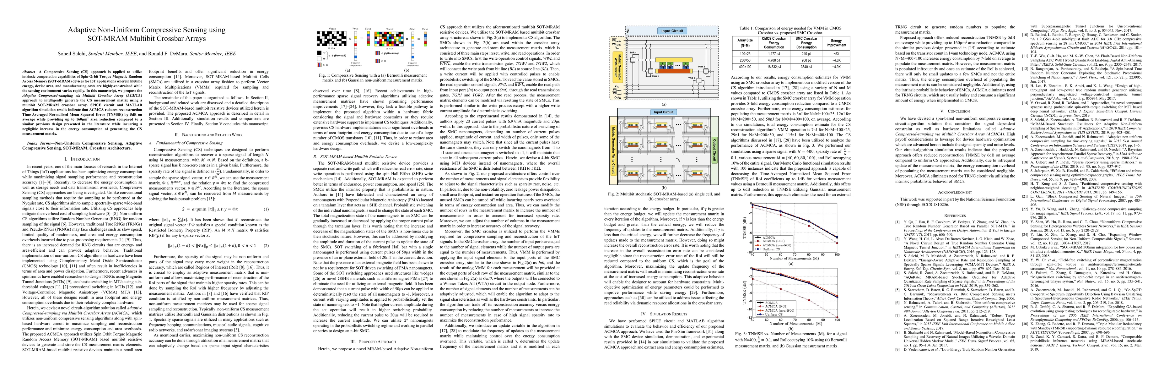 This paper proposes an Adaptive Compressed-sampling via Multibit Crossbar Array (ACMCA) approach for IoT applications using SOT-MRAM devices. The ACMCA method reduces reconstruction error and area, achieving a 5dB improvement in Time-Averaged Normalized Mean Squared Error (TNMSE) compared to previous designs.