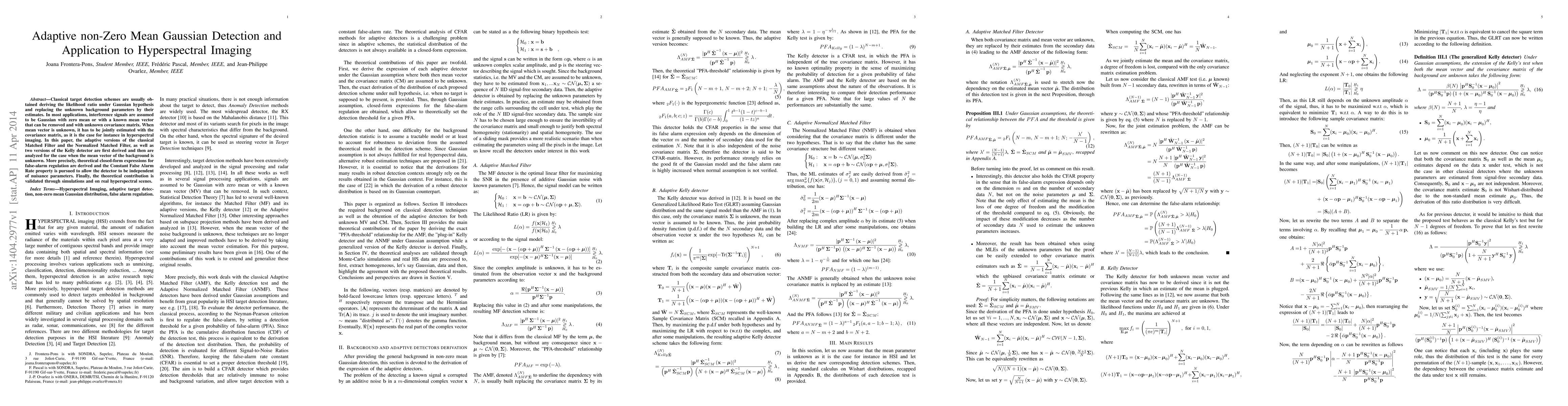 Researchers developed adaptive detection methods for hyperspectral imaging, improving target detection in noisy environments with unknown background parameters. Their new approach uses closed-form expressions to regulate false alarms and achieves independence from nuisance parameters.