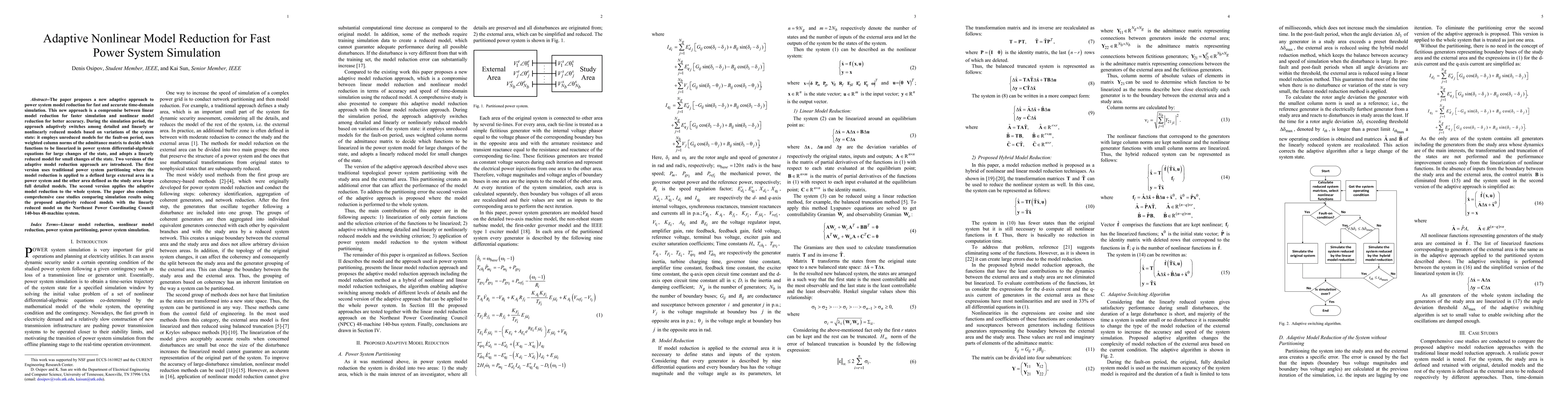 This paper introduces an adaptive nonlinear model reduction technique for efficient power system simulations, switching between detailed and reduced models based on system state variations. The approach is tested on a large power system model, demonstrating improved accuracy and speed compared to traditional linear reductions.