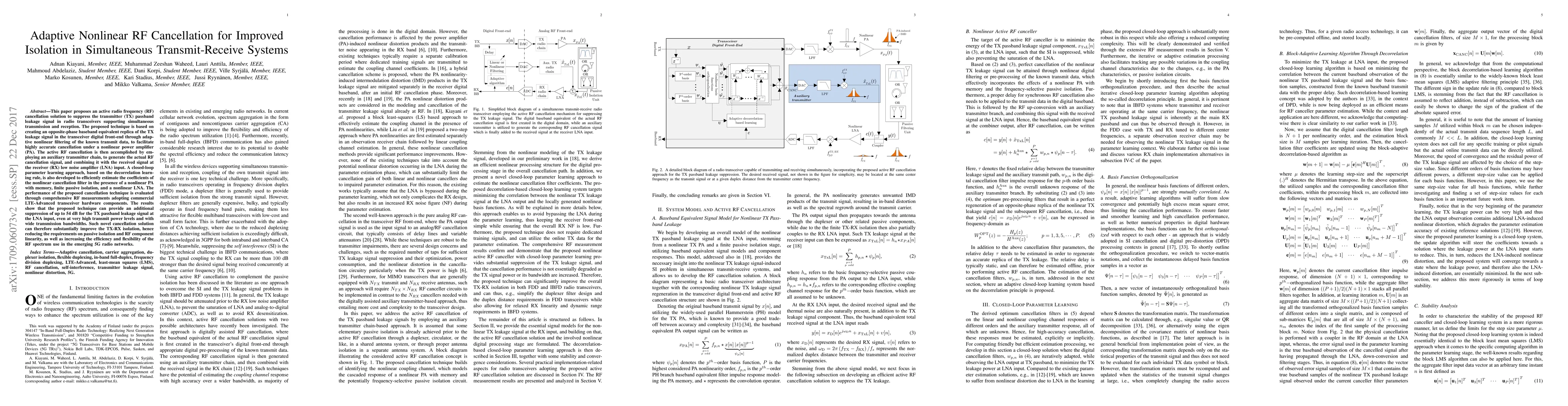 This paper proposes an active radio frequency (RF) cancellation solution to suppress the transmitter (TX) passband leakage signal in radio transceivers supporting simultaneous transmission and reception. The proposed technique is based on creating an opposite-phase baseband equivalent replica of the TX leakage signal in the transceiver digital front-end through adaptive nonlinear filtering of the known transmit data, to facilitate highly accurate cancellation under a nonlinear TX power amplifier (PA). The active RF cancellation is then accomplished by employing an auxiliary transmitter chain, to generate the actual RF cancellation signal, and combining it with the received signal at the receiver (RX) low noise amplifier (LNA) input. A closed-loop parameter learning approach, based on the decorrelation principle, is also developed to efficiently estimate the coefficients of the nonlinear cancellation filter in the presence of a nonlinear TX PA with memory, finite passive isolation, and a nonlinear RX LNA. The performance of the proposed cancellation technique is evaluated through comprehensive RF measurements adopting commercial LTE-Advanced transceiver hardware components. The results show that the proposed technique can provide an additional suppression of up to 54 dB for the TX passband leakage signal at the RX LNA input, even at considerably high transmit power levels and with wide transmission bandwidths. Such novel cancellation solution can therefore substantially improve the TX-RX isolation, hence reducing the requirements on passive isolation and RF component linearity, as well as increasing the efficiency and flexibility of the RF spectrum use in the emerging 5G radio networks.