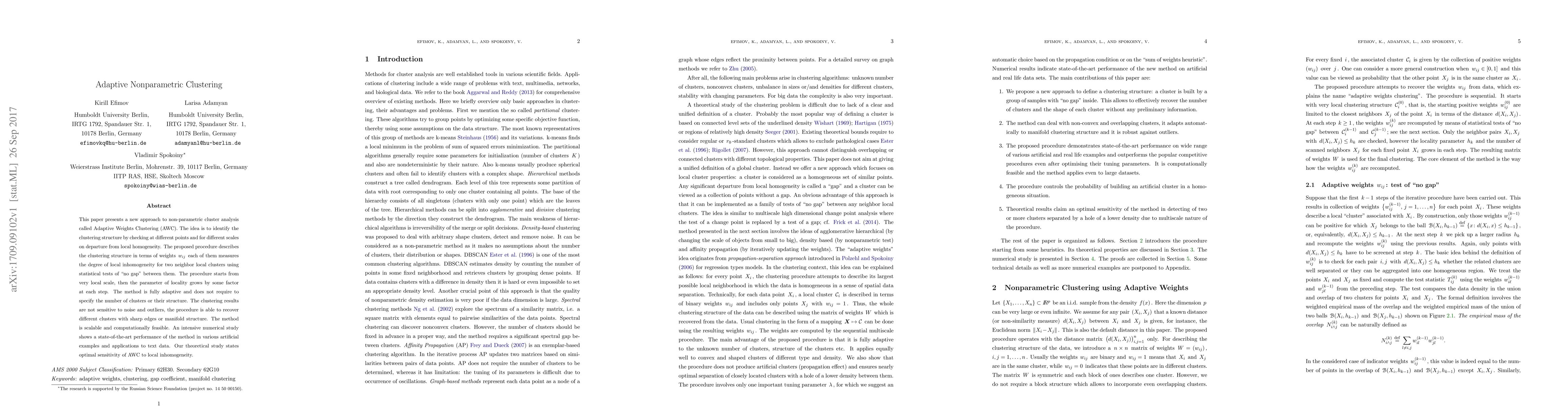 This paper introduces Adaptive Weights Clustering (AWC), a non-parametric clustering approach that identifies clusters based on local inhomogeneity measures, offering scalable and robust results with minimal computational requirements.