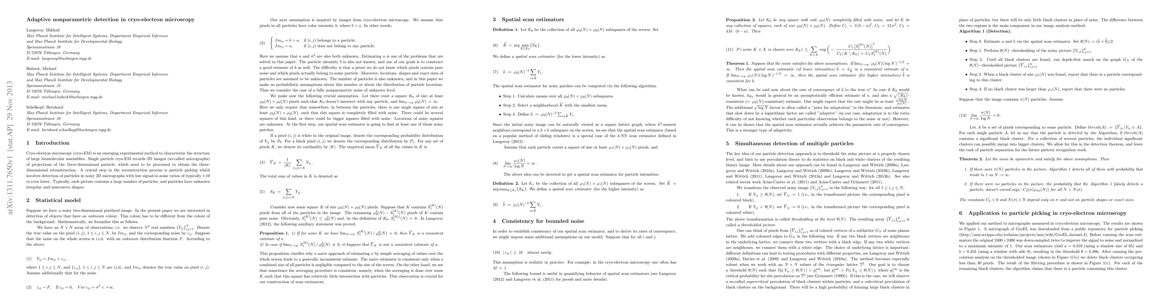 This paper proposes an adaptive nonparametric detection method for identifying particles in noisy cryo-electron microscopy micrographs, addressing the challenge of low signal-to-noise ratios and irregular particle shapes to improve three-dimensional reconstruction accuracy. The method aims to enhance particle picking efficiency in the complex and noisy data typical of cryo-EM.