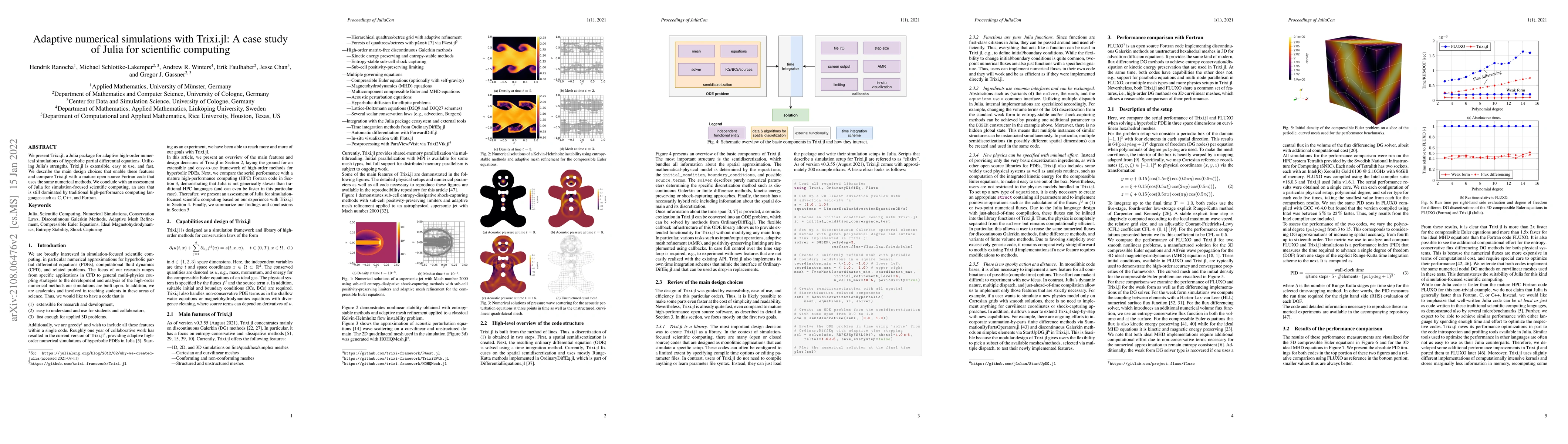 This research paper introduces Trixi.jl, a Julia package for adaptive numerical simulations of hyperbolic PDEs, showcasing its extensibility, ease of use, and speed, and highlighting Julia's potential as a language for scientific computing.