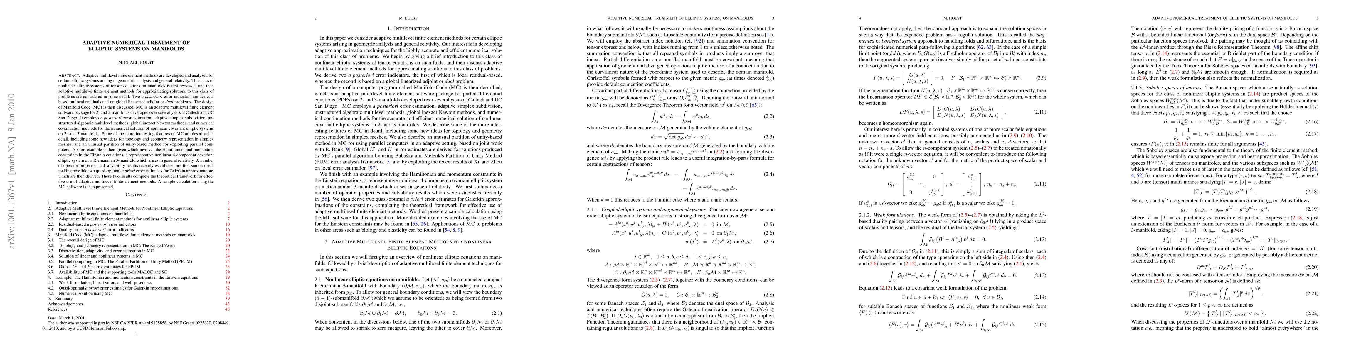Adaptive multilevel finite element methods are developed and analyzed for certain elliptic systems arising in geometric analysis and general relativity. This class of nonlinear elliptic systems of tensor equations on manifolds is first reviewed, and then adaptive multilevel finite element methods for approximating solutions to this class of problems are considered in some detail. Two a posteriori error indicators are derived, based on local residuals and on global linearized adjoint or dual problems. The design of Manifold Code (MC) is then discussed; MC is an adaptive multilevel finite element software package for 2- and 3-manifolds. It employs a posteriori error estimation, adaptive simplex subdivision, unstructured algebraic multilevel methods, global inexact Newton methods, and numerical continuation methods for the numerical solution of nonlinear covariant elliptic systems on 2- and 3-manifolds. Some of the more interesting features of MC are described in detail, including some new ideas for topology and geometry representation in simplex meshes, and an unusual partition of unity-based method for exploiting parallel computers. A short example is then given which involves the Hamiltonian and momentum constraints in the Einstein equations, a representative nonlinear 4-component covariant elliptic system on a Riemannian 3-manifold which arises in general relativity. A number of operator properties and solvability results recently established are first summarized, making possible two quasi-optimal a priori error estimates for Galerkin approximations which are then derived. These two results complete the theoretical framework for effective use of adaptive multilevel finite element methods. A sample calculation using the MC software is then presented.