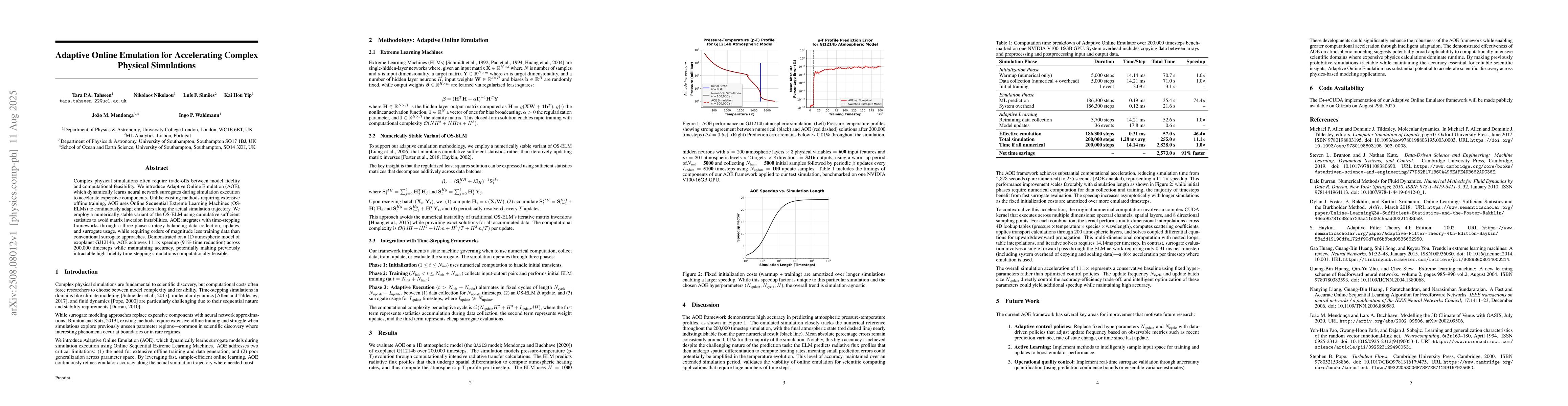 Complex physical simulations often require trade-offs between model fidelity and computational feasibility. We introduce Adaptive Online Emulation (AOE), which dynamically learns neural network surrogates during simulation execution to accelerate expensive components. Unlike existing methods requiring extensive offline training, AOE uses Online Sequential Extreme Learning Machines (OS-ELMs) to continuously adapt emulators along the actual simulation trajectory. We employ a numerically stable variant of the OS-ELM using cumulative sufficient statistics to avoid matrix inversion instabilities. AOE integrates with time-stepping frameworks through a three-phase strategy balancing data collection, updates, and surrogate usage, while requiring orders of magnitude less training data than conventional surrogate approaches. Demonstrated on a 1D atmospheric model of exoplanet GJ1214b, AOE achieves 11.1 times speedup (91% time reduction) across 200,000 timesteps while maintaining accuracy, potentially making previously intractable high-fidelity time-stepping simulations computationally feasible.
