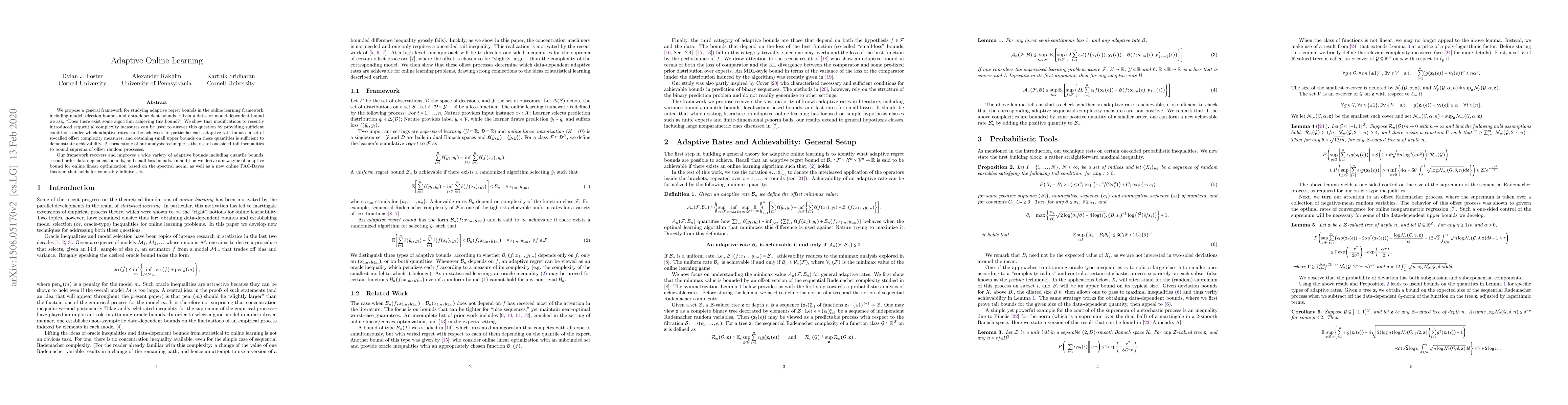 This paper introduces a framework for adaptive regret bounds in online learning, demonstrating how modifications to sequential complexity measures can achieve adaptive rates. It utilizes one-sided tail inequalities to establish achievability and improves various adaptive bounds, including new bounds for online linear optimization and an online PAC-Bayes theorem.