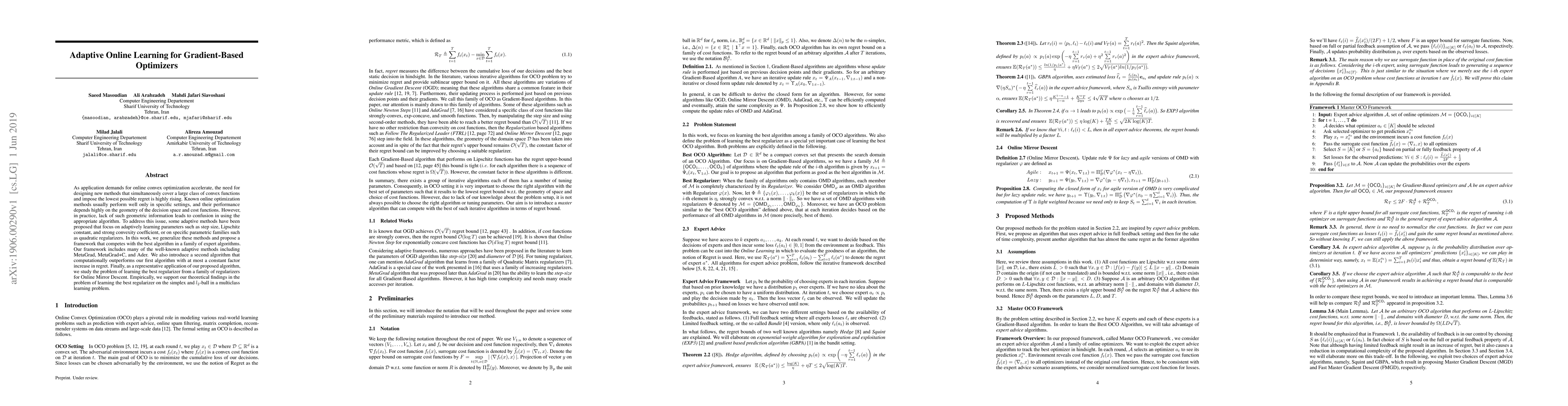 This paper proposes a framework for adaptive online learning that generalizes existing adaptive methods to compete with the best algorithm in a family of expert algorithms. The framework includes computationally efficient algorithms that achieve at most a constant factor increase in regret and is demonstrated through the problem of learning the best regularizer for Online Mirror Descent.