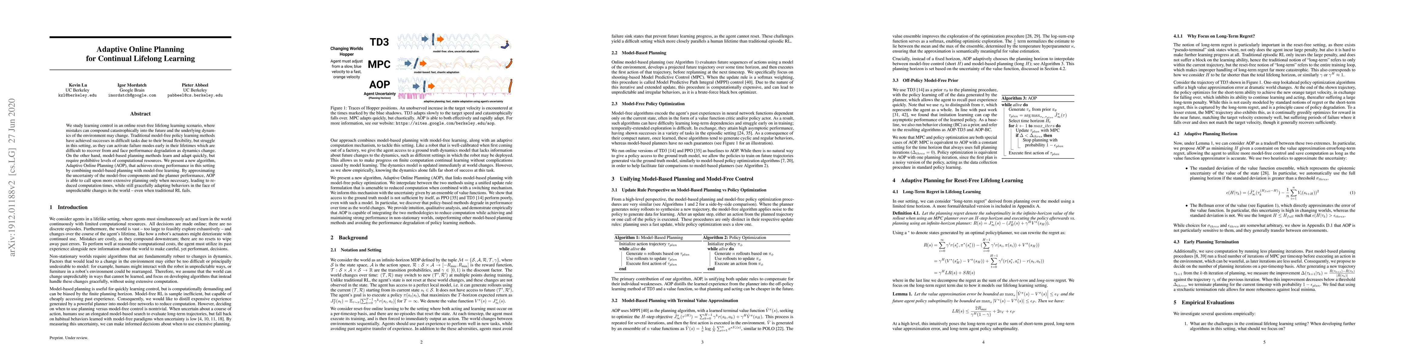 This paper introduces Adaptive Online Planning (AOP), a novel algorithm that combines model-based planning with model-free learning to achieve robust performance in reset-free lifelong learning environments. AOP optimizes computational resources by selectively invoking extensive planning when necessary, thus adapting to dynamic changes without the performance degradation seen in traditional methods.