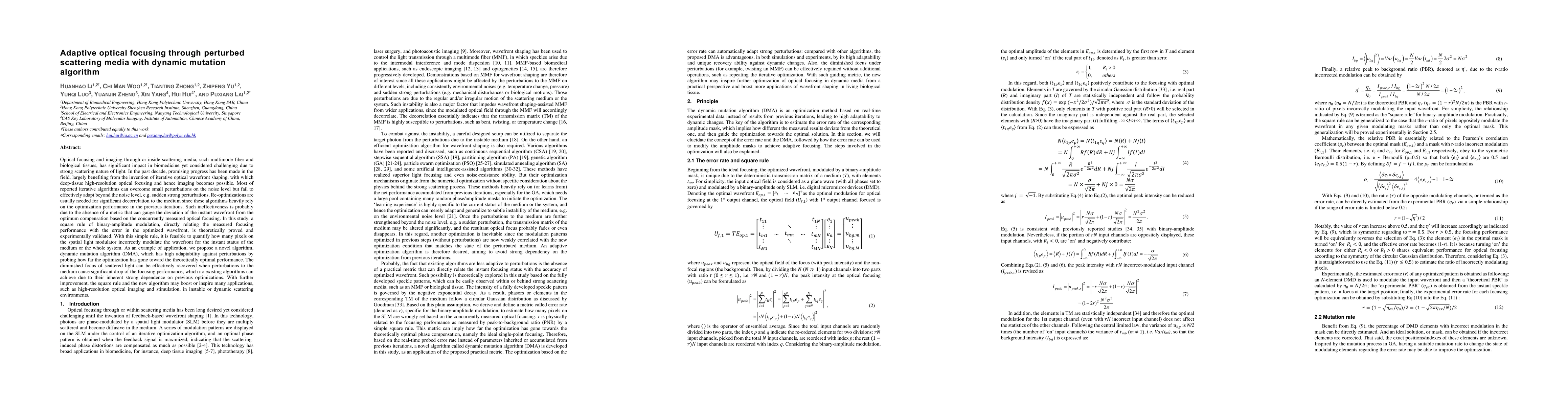 This paper proposes a novel dynamic mutation algorithm for adaptive optical focusing through perturbed scattering media, such as biological tissues. It introduces a square rule of binary-amplitude modulation to quantify the deviation of the wavefront from the optimum, enabling high adaptability to sudden strong perturbations without the need for re-optimization.