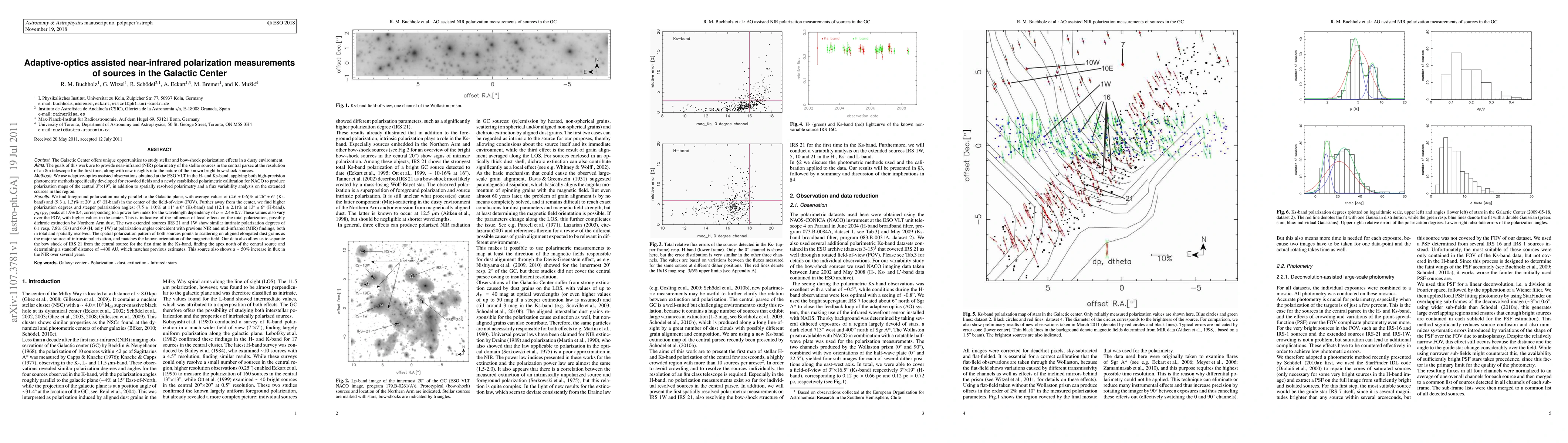 The goals of this work are to provide NIR polarimetry of the stellar sources in the central pc at the resolution of an 8m telescope for the first time, along with new insights into the nature of the known bright bow-shock sources. We use AO assisted observations with the ESO VLT in the H- and Ks-band, applying high precision photometric methods developed for crowded fields and a new polarimetric calibration for NACO to produce polarization maps of the central 3"x19", in addition to spatially resolved polarimetry and a variability analysis on the extended sources. We find foreground polarization parallel to the Galactic plane, with averages of (4.6+/-0.6)% at 26{\deg}+/-6{\deg} (Ks) and (9.3+/-1.3)% at 20{\deg}+/-6{\deg} (H) in the center. At larger distances from the center, we find different polarization parameters: (7.5+/-1.0)% at 11{\deg}+/-6{\deg} (Ks) and (12.1+/-2.1)% at 13{\deg}+/-6{\deg} (H). p_H/p_Ks peaks at 1.9+/-0.4, with a power law index for the wavelength dependency of alpha = 2.4+/-0.7. This also varies over the FOV, with higher values in the center, indicating local effects on the total polarization, possibly dichroic extinction by Northern Arm dust. The two extended sources IRS 21 and 1W show similar intrinsic polarization degrees of 6.1% resp. 7.8% (Ks) and 6.9% (H, only 1W) at polarization angles coincident with previous NIR and MIR findings, both in total and resolved. The spatial polarization pattern of both sources points to scattering on aligned elongated dust grains as the major source of intrinsic polarization, and matches the known orientation of the magnetic field. Our data also allows us to separate the bow shock of IRS 21 from the central source for the first time in the Ks-band, with the apex north of the center and a standoff distance of ~400 AU, matching previous estimates. This source also shows a ~50% increase in flux in the NIR over several years.