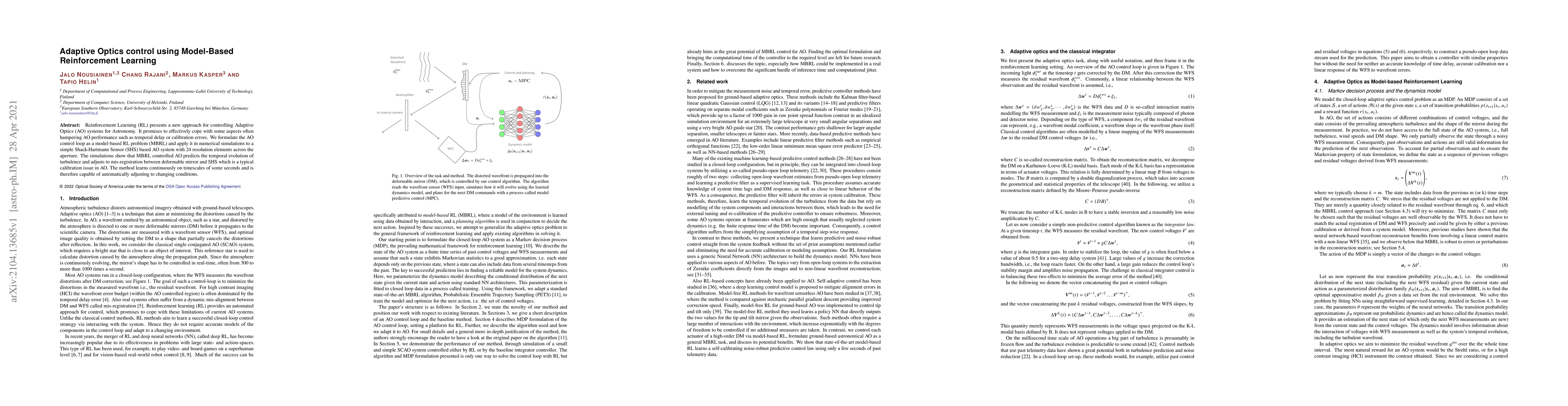 This paper proposes using Model-Based Reinforcement Learning (MBRL) to control Adaptive Optics (AO) systems in astronomy, demonstrating improved performance over traditional methods by predicting temporal turbulence and adjusting to calibration issues. Simulation results show that MBRL can continuously learn and adapt to changing conditions over seconds.