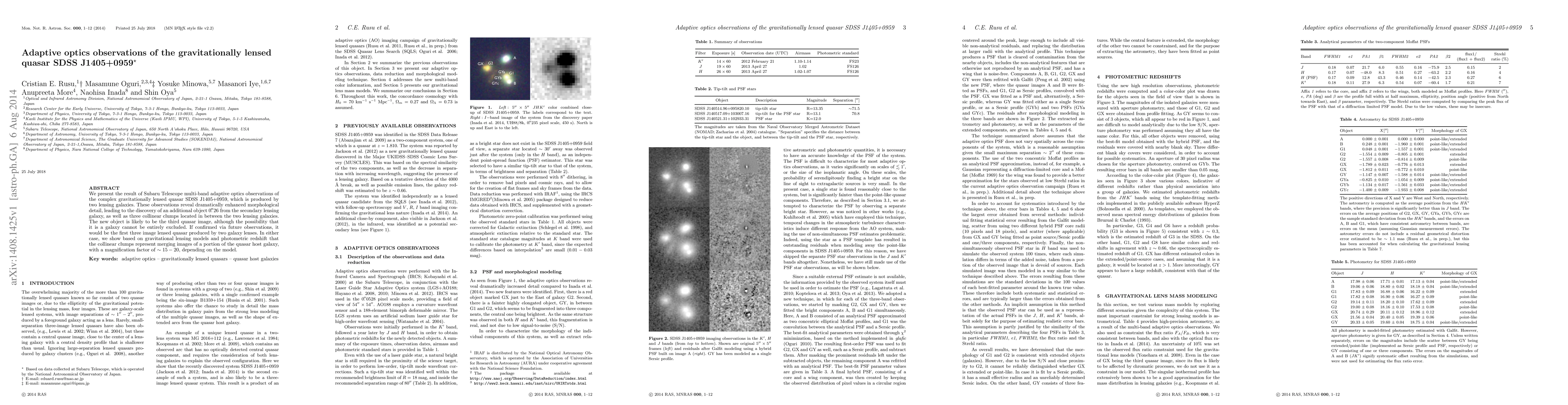 We present the result of Subaru Telescope multi-band adaptive optics observations of the complex gravitationally lensed quasar SDSS J1405+0959, which is produced by two lensing galaxies. These observations reveal dramatically enhanced morphological detail, leading to the discovery of an additional object 0. 26'' from the secondary lensing galaxy, as well as three collinear clumps located in between the two lensing galaxies. The new object is likely to be the third quasar image, although the possibility that it is a galaxy cannot be entirely excluded. If confirmed via future observations, it would be the first three image lensed quasar produced by two galaxy lenses. In either case, we show based on gravitational lensing models and photometric redshift that the collinear clumps represent merging images of a portion of the quasar host galaxy, with a magnification factor of 15 - 20, depending on the model.