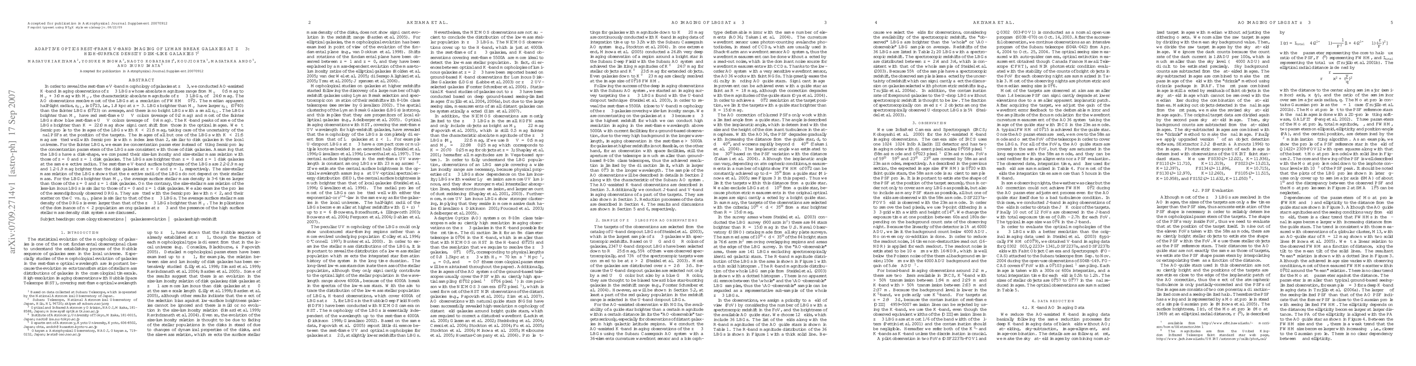 This study uses adaptive optics to observe Lyman Break Galaxies (LBGs) at z~3, revealing that brighter LBGs exhibit disk-like structures with high surface stellar mass density, similar to disk galaxies in the local universe but with significantly higher brightness and mass density. The findings suggest the prevalence of disk galaxies with n<2 profiles at this epoch.