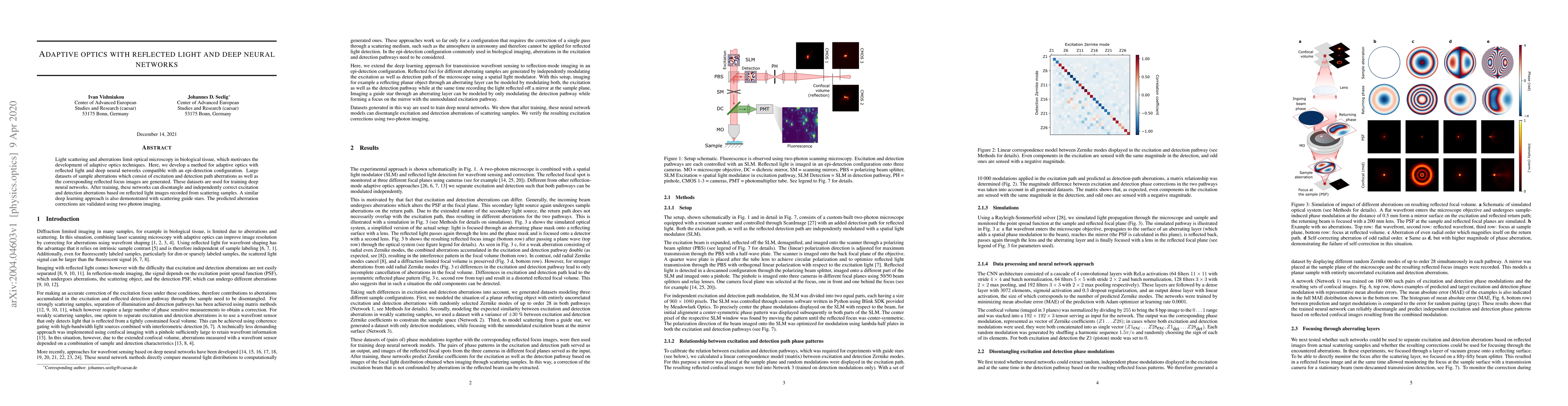 This paper presents an adaptive optics technique using reflected light and deep neural networks to correct optical aberrations in biological tissue microscopy. The method trains neural networks on large datasets of sample aberrations and reflected focus images to independently correct excitation and detection path aberrations, validated through two photon imaging.