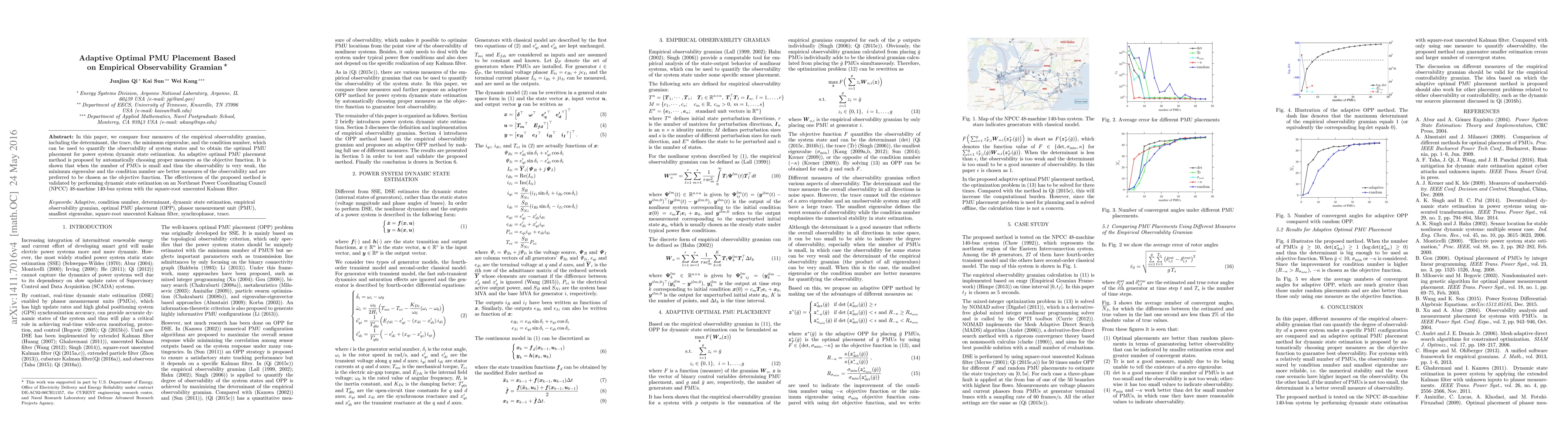 In this paper, we compare four measures of the empirical observability gramian, including the determinant, the trace, the minimum eigenvalue, and the condition number, which can be used to quantify the observability of system states and to obtain the optimal PMU placement for power system dynamic state estimation. An adaptive optimal PMU placement method is proposed by automatically choosing proper measures as the objective function. It is shown that when the number of PMUs is small and thus the observability is very weak, the minimum eigenvalue and the condition number are better measures of the observability and are preferred to be chosen as the objective function. The effectiveness of the proposed method is validated by performing dynamic state estimation on an Northeast Power Coordinating Council (NPCC) 48-machine 140-bus system with the square-root unscented Kalman filter.