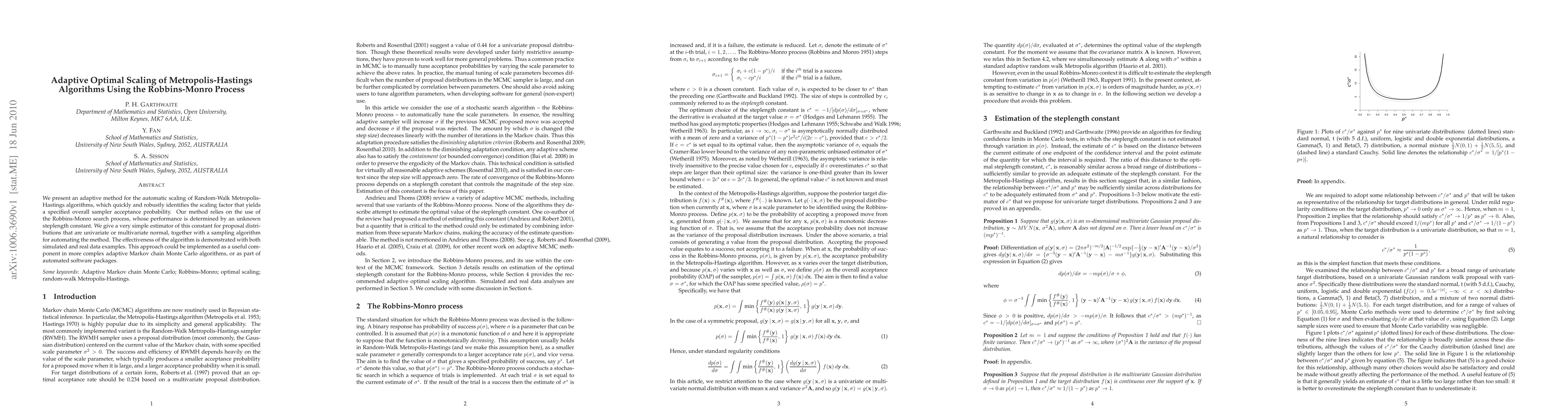 This paper introduces an adaptive method for scaling Random-Walk Metropolis-Hastings algorithms using the Robbins-Monro process to determine optimal scaling factors for specified acceptance probabilities. The method includes a simple estimator for the steplength constant and is demonstrated to be effective on both simulated and real data.