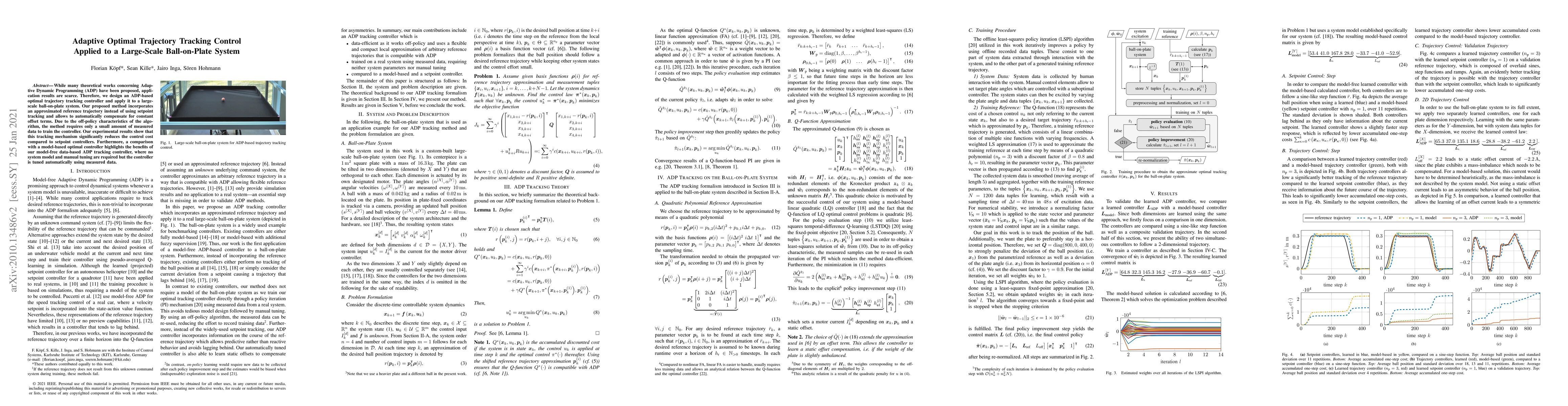 This paper proposes an Adaptive Dynamic Programming (ADP) based optimal trajectory tracking controller for a large-scale ball-on-plate system, which uses an approximated reference trajectory and requires minimal training data. Experimental results show that the method reduces control cost and outperforms setpoint controllers, demonstrating the benefits of a model-free, data-driven ADP approach.