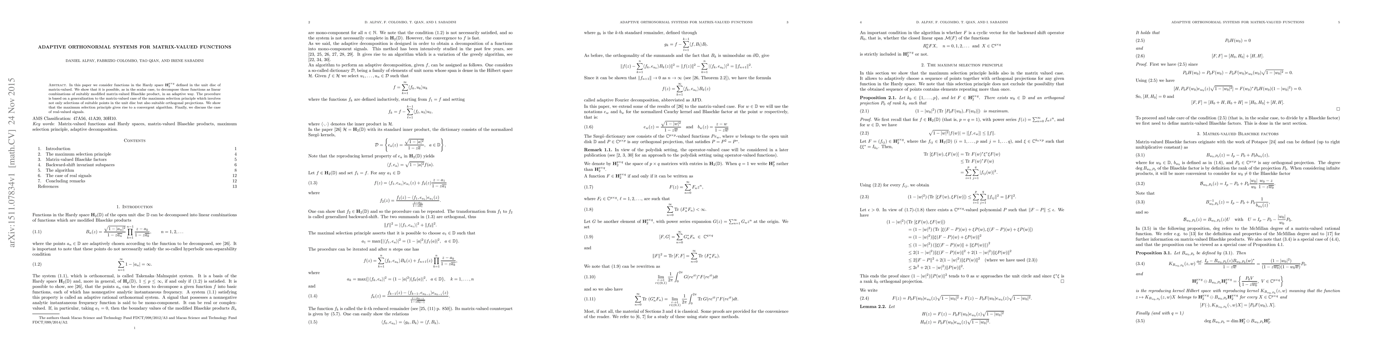 In this paper we consider functions in the Hardy space $\mathbf{H}_2^{p\times q}$ defined in the unit disc of matrix-valued. We show that it is possible, as in the scalar case, to decompose those functions as linear combinations of suitably modified matrix-valued Blaschke product, in an adaptive way. The procedure is based on a generalization to the matrix-valued case of the maximum selection principle which involves not only selections of suitable points in the unit disc but also suitable orthogonal projections. We show that the maximum selection principle gives rise to a convergent algorithm. Finally, we discuss the case of real-valued signals.