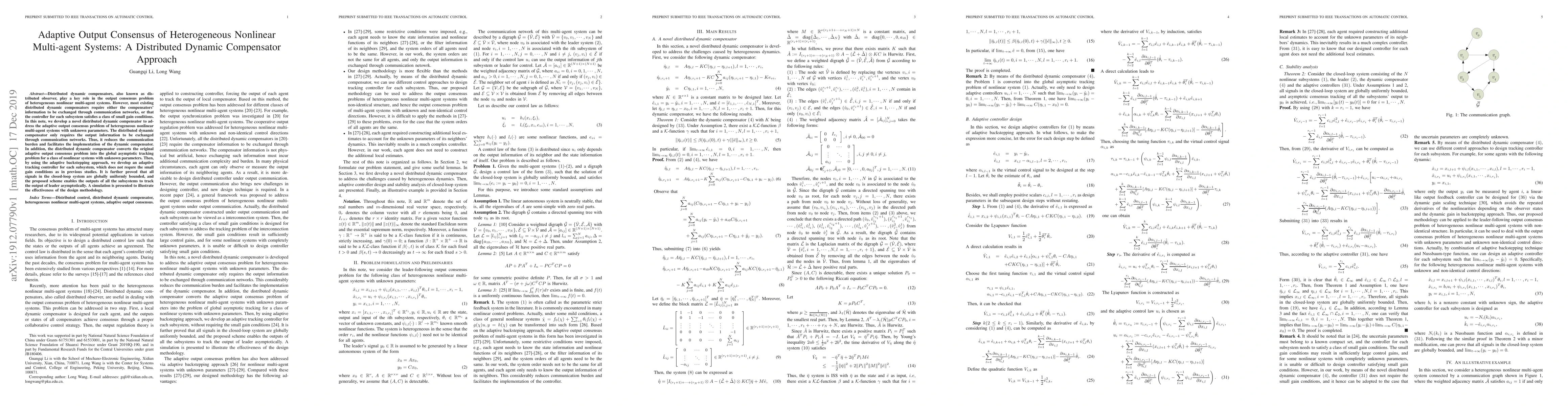 Distributed dynamic compensators, also known as distributed observer, play a key role in the output consensus problem of heterogeneous nonlinear multi-agent systems. However, most existing distributed dynamic compensators require either the compensators' information to be exchanged through communication networks, or that the controller for each subsystem satisfies a class of small gain conditions. In this note, we develop a novel distributed dynamic compensator to address the adaptive output consensus problem of heterogeneous nonlinear multi-agent systems with unknown parameters. The distributed dynamic compensator only requires the output information to be exchanged through communication networks. Thus, it reduces the communication burden and facilitates the implementation of the dynamic compensator. In addition, the distributed dynamic compensator converts the original adaptive output consensus problem into the global asymptotic tracking problem for a class of nonlinear systems with unknown parameters. Then, by using the adaptive backstepping approach, we develop an adaptive tracking controller for each subsystem, which does not requre the small gain conditions as in previous studies. It is further proved that all signals in the closed-loop system are globally uniformly bounded, and the proposed scheme enables the outputs of all the subsystems to track the output of leader asymptotically. A simulation is presented to illustrate the effectiveness of the design methodology.