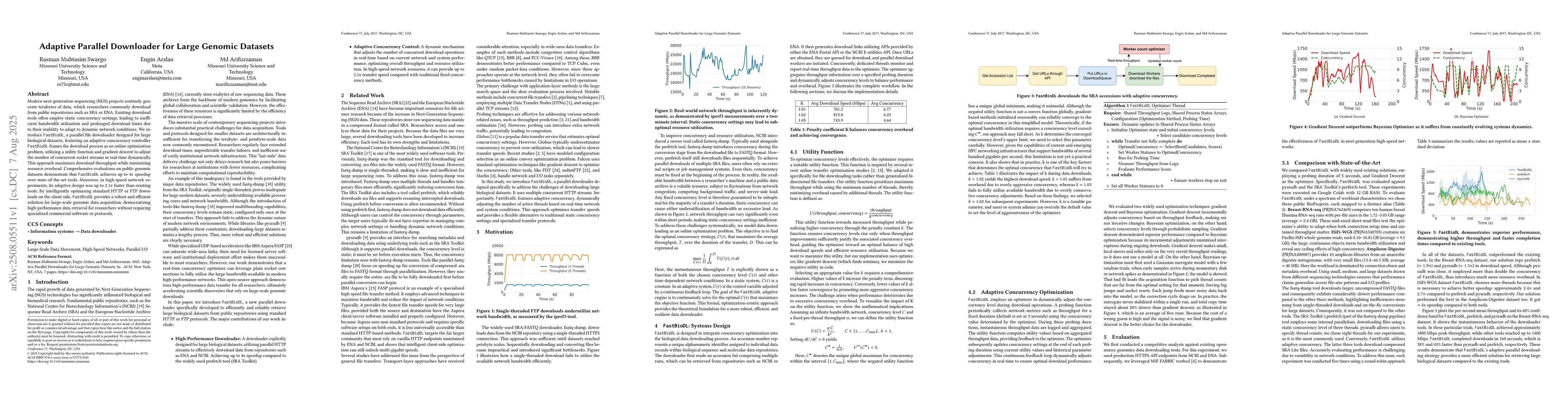 Modern next-generation sequencing (NGS) projects routinely generate terabytes of data, which researchers commonly download from public repositories such as SRA or ENA. Existing download tools often employ static concurrency settings, leading to inefficient bandwidth utilization and prolonged download times due to their inability to adapt to dynamic network conditions. We introduce FastBioDL, a parallel file downloader designed for large biological datasets, featuring an adaptive concurrency controller. FastBioDL frames the download process as an online optimization problem, utilizing a utility function and gradient descent to adjust the number of concurrent socket streams in real-time dynamically. This approach maximizes download throughput while minimizing resource overhead. Comprehensive evaluations on public genomic datasets demonstrate that FastBioDL achieves up to $4x$ speedup over state-of-the-art tools. Moreover, in high-speed network experiments, its adaptive design was up to $2.1x$ faster than existing tools. By intelligently optimizing standard HTTP or FTP downloads on the client side, FastBioDL provides a robust and efficient solution for large-scale genomic data acquisition, democratizing high-performance data retrieval for researchers without requiring specialized commercial software or protocols.