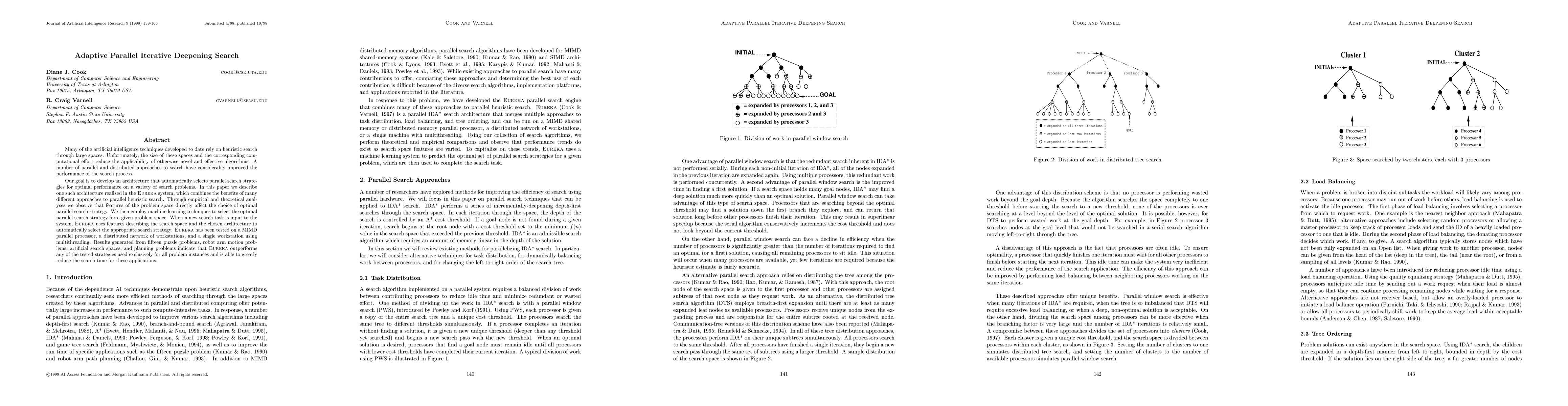 Many of the artificial intelligence techniques developed to date rely on heuristic search through large spaces. Unfortunately, the size of these spaces and the corresponding computational effort reduce the applicability of otherwise novel and effective algorithms. A number of parallel and distributed approaches to search have considerably improved the performance of the search process. Our goal is to develop an architecture that automatically selects parallel search strategies for optimal performance on a variety of search problems. In this paper we describe one such architecture realized in the Eureka system, which combines the benefits of many different approaches to parallel heuristic search. Through empirical and theoretical analyses we observe that features of the problem space directly affect the choice of optimal parallel search strategy. We then employ machine learning techniques to select the optimal parallel search strategy for a given problem space. When a new search task is input to the system, Eureka uses features describing the search space and the chosen architecture to automatically select the appropriate search strategy. Eureka has been tested on a MIMD parallel processor, a distributed network of workstations, and a single workstation using multithreading. Results generated from fifteen puzzle problems, robot arm motion problems, artificial search spaces, and planning problems indicate that Eureka outperforms any of the tested strategies used exclusively for all problem instances and is able to greatly reduce the search time for these applications.