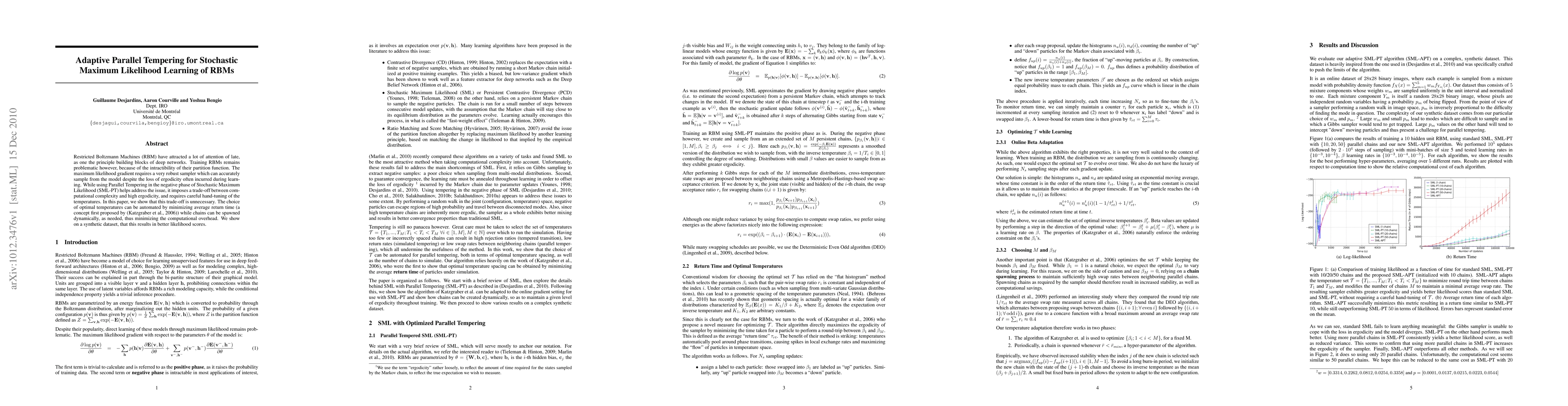 Restricted Boltzmann Machines (RBM) have attracted a lot of attention of late, as one the principle building blocks of deep networks. Training RBMs remains problematic however, because of the intractibility of their partition function. The maximum likelihood gradient requires a very robust sampler which can accurately sample from the model despite the loss of ergodicity often incurred during learning. While using Parallel Tempering in the negative phase of Stochastic Maximum Likelihood (SML-PT) helps address the issue, it imposes a trade-off between computational complexity and high ergodicity, and requires careful hand-tuning of the temperatures. In this paper, we show that this trade-off is unnecessary. The choice of optimal temperatures can be automated by minimizing average return time (a concept first proposed by [Katzgraber et al., 2006]) while chains can be spawned dynamically, as needed, thus minimizing the computational overhead. We show on a synthetic dataset, that this results in better likelihood scores.