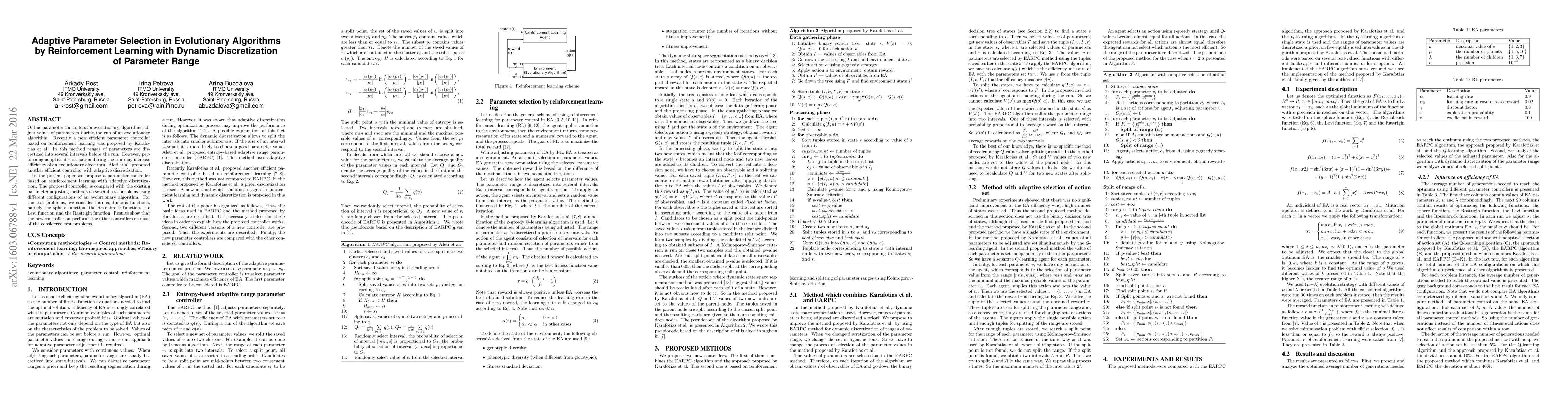 This paper proposes a novel adaptive parameter controller for evolutionary algorithms based on reinforcement learning with dynamic discretization of parameter ranges. The new controller outperforms existing methods on various test problems, demonstrating improved efficiency and performance.