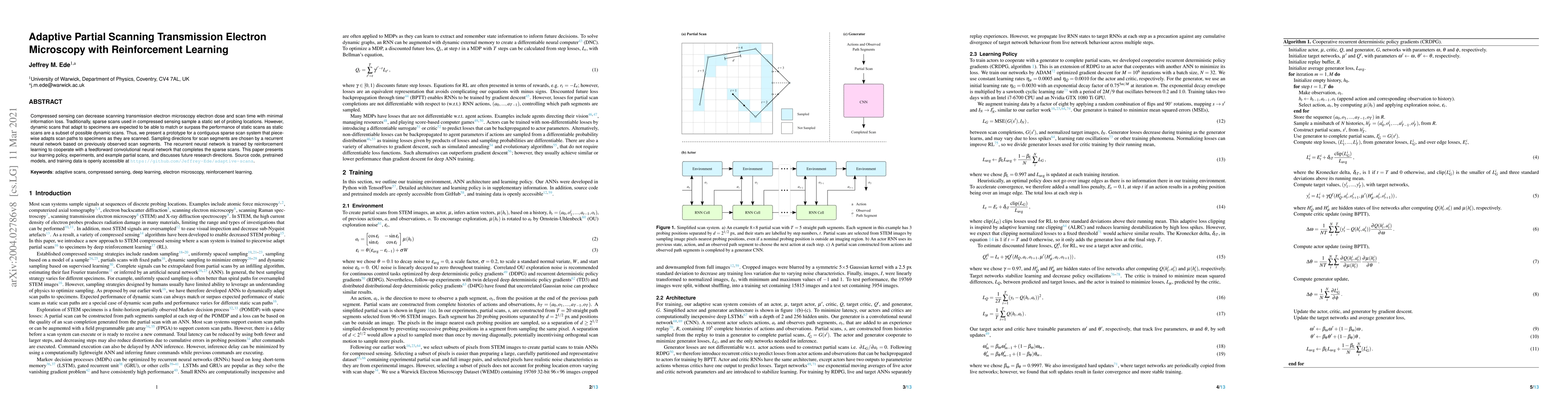 This paper introduces an adaptive partial scanning transmission electron microscopy (STEM) system using reinforcement learning to optimize scan paths dynamically. The system employs a recurrent neural network trained by reinforcement learning to select adaptive sampling directions, enhancing the efficiency of sparse scans compared to static methods.