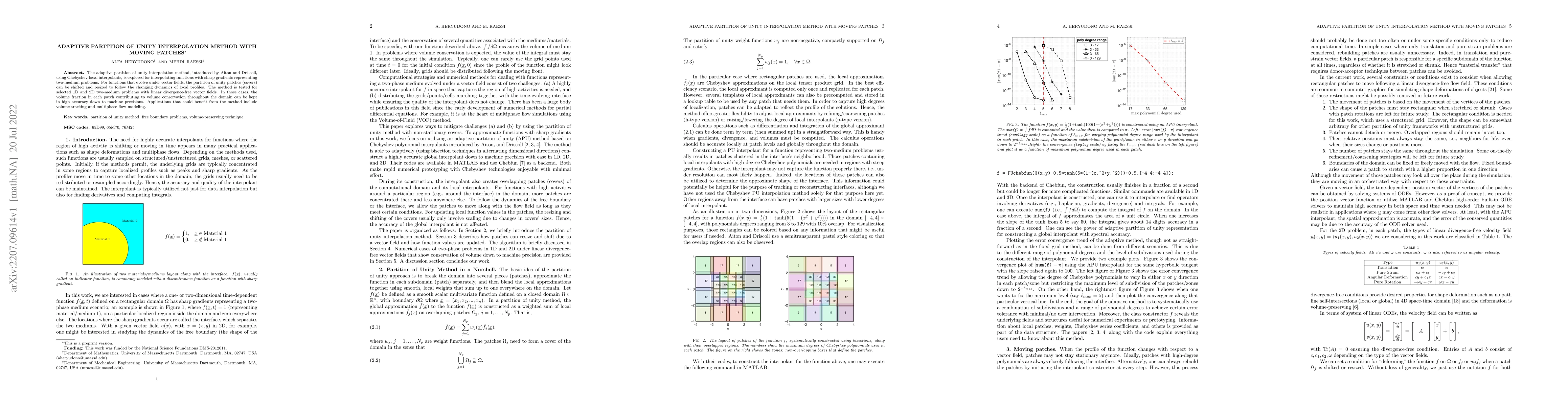 The adaptive partition of unity interpolation method, introduced by Aiton and Driscoll, using Chebyshev local interpolants, is explored for interpolating functions with sharp gradients representing two-medium problems. For functions that evolve under vector fields, the partition of unity patches (covers) can be shifted and resized to follow the changing dynamics of local profiles. The method is tested for selected 1D and 2D two-medium problems with linear divergence-free vector fields. In those cases, the volume fraction in each patch contributing to volume conservation throughout the domain can be kept in high accuracy down to machine precisions. Applications that could benefit from the method include volume tracking and multiphase flow modeling.