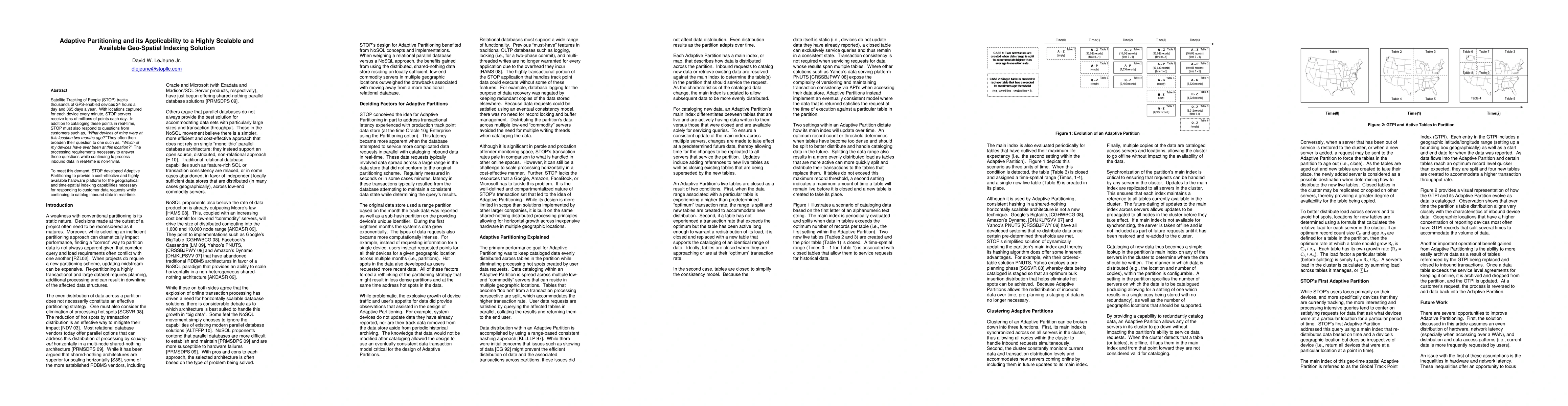 Satellite Tracking of People (STOP) tracks thousands of GPS-enabled devices 24 hours a day and 365 days a year. With locations captured for each device every minute, STOP servers receive tens of millions of points each day. In addition to cataloging these points in real-time, STOP must also respond to questions from customers such as, "What devices of mine were at this location two months ago?" They often then broaden their question to one such as, "Which of my devices have ever been at this location?" The processing requirements necessary to answer these questions while continuing to process inbound data in real-time is non-trivial. To meet this demand, STOP developed Adaptive Partitioning to provide a cost-effective and highly available hardware platform for the geographical and time-spatial indexing capabilities necessary for responding to customer data requests while continuing to catalog inbound data in real-time.