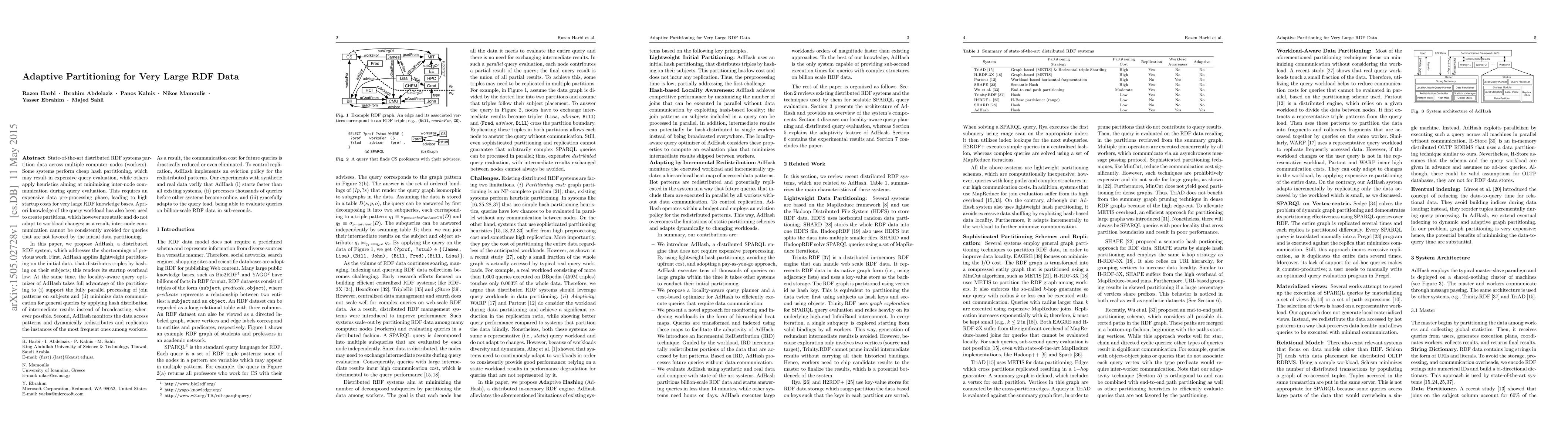 This paper introduces AdHash, a distributed RDF system that employs lightweight initial partitioning and adaptive redistribution to minimize query evaluation costs. AdHash dynamically adapts to changing data access patterns, significantly reducing inter-node communication and startup overhead for large RDF datasets.