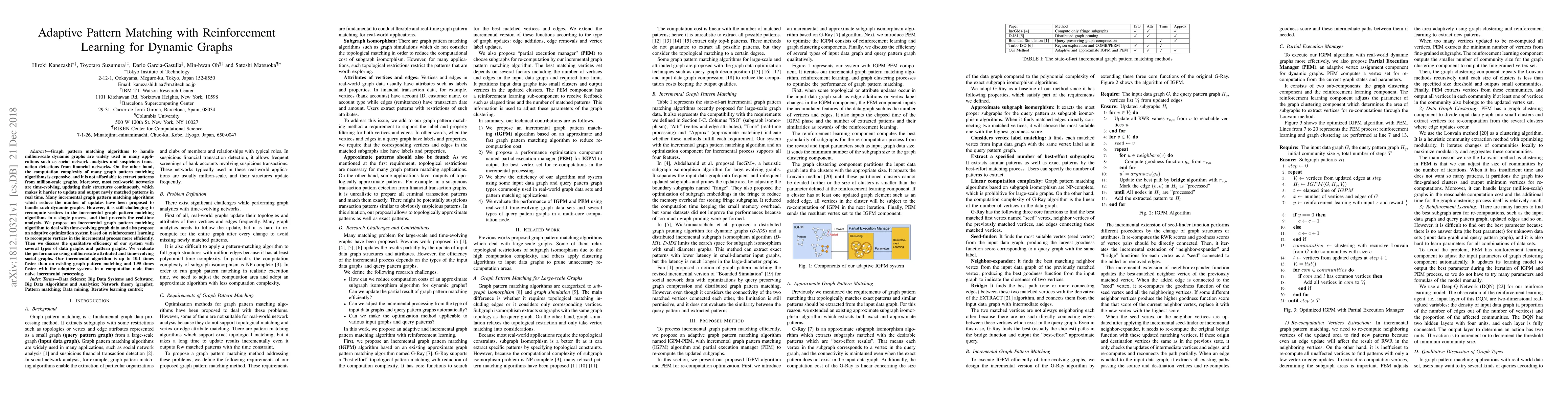 This paper proposes an adaptive pattern matching algorithm using reinforcement learning for incremental updates in dynamic graphs, significantly improving efficiency over existing methods. The proposed system achieves up to 10.1 times faster performance on million-scale social graphs compared to traditional approaches.