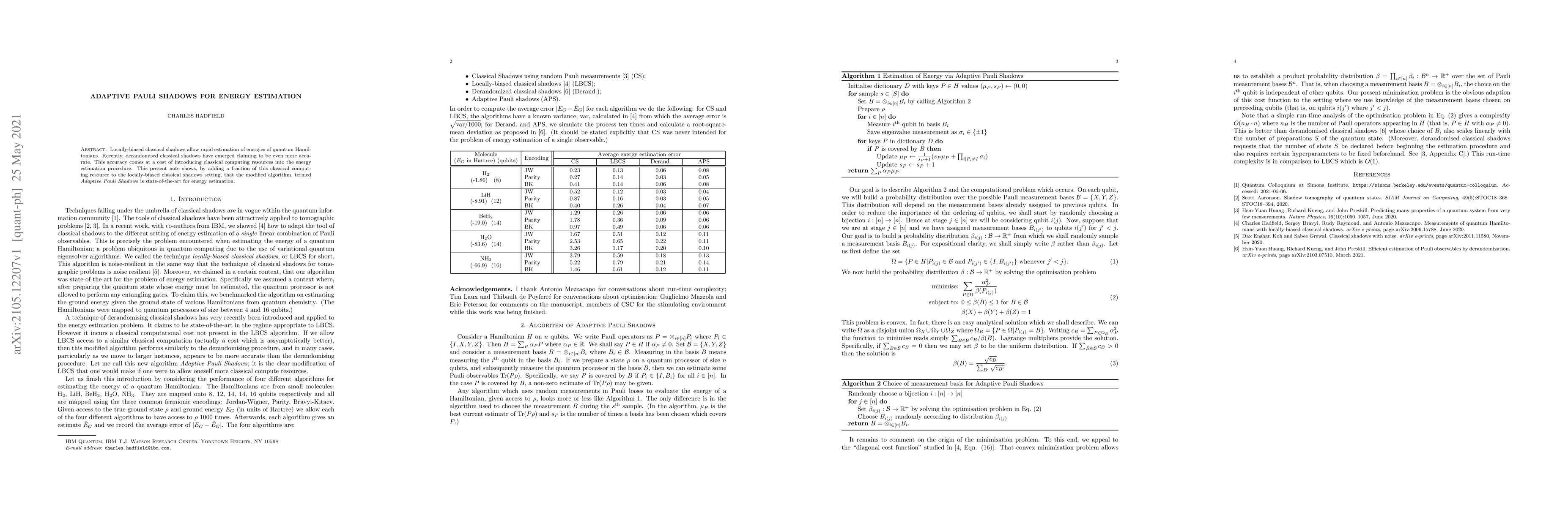 Locally-biased classical shadows allow rapid estimation of energies of quantum Hamiltonians. Recently, derandomised classical shadows have emerged claiming to be even more accurate. This accuracy comes at a cost of introducing classical computing resources into the energy estimation procedure. This present note shows, by adding a fraction of this classical computing resource to the locally-biased classical shadows setting, that the modified algorithm, termed Adaptive Pauli Shadows is state-of-the-art for energy estimation.