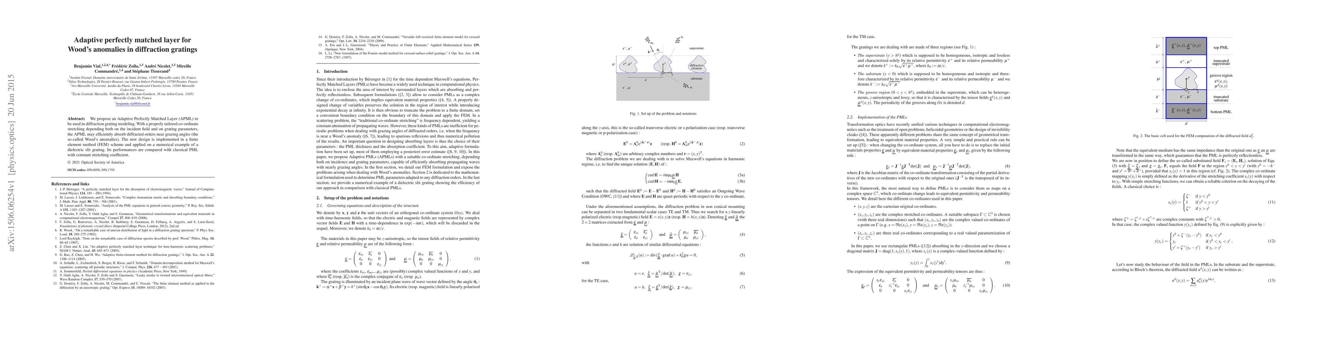 This paper proposes an Adaptive Perfectly Matched Layer (APML) to efficiently absorb diffracted orders near grazing angles in diffraction grating modeling, addressing Wood's anomalies. The APML uses coordinate stretching tailored to the incident field and grating parameters, and is implemented in a finite element method for a dielectric slit grating, outperforming classical PML with constant stretching.
