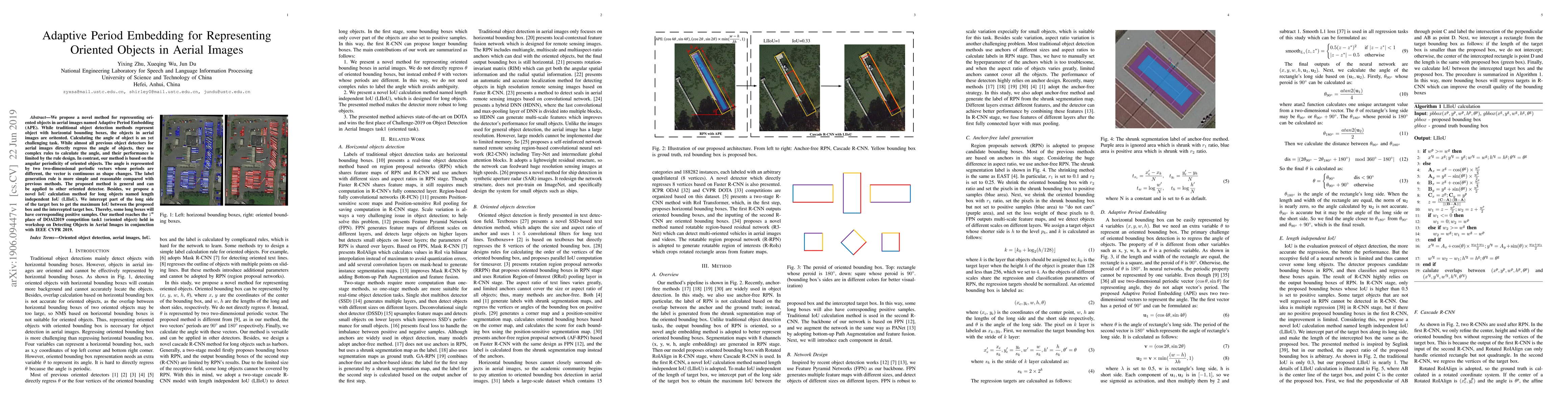 The paper introduces Adaptive Period Embedding (APE) for representing oriented objects in aerial images, using angular periodicity to simplify angle calculation and proposing a Length Independent IoU (LIIoU) for long object detection, achieving top results in the DOAI2019 competition.
