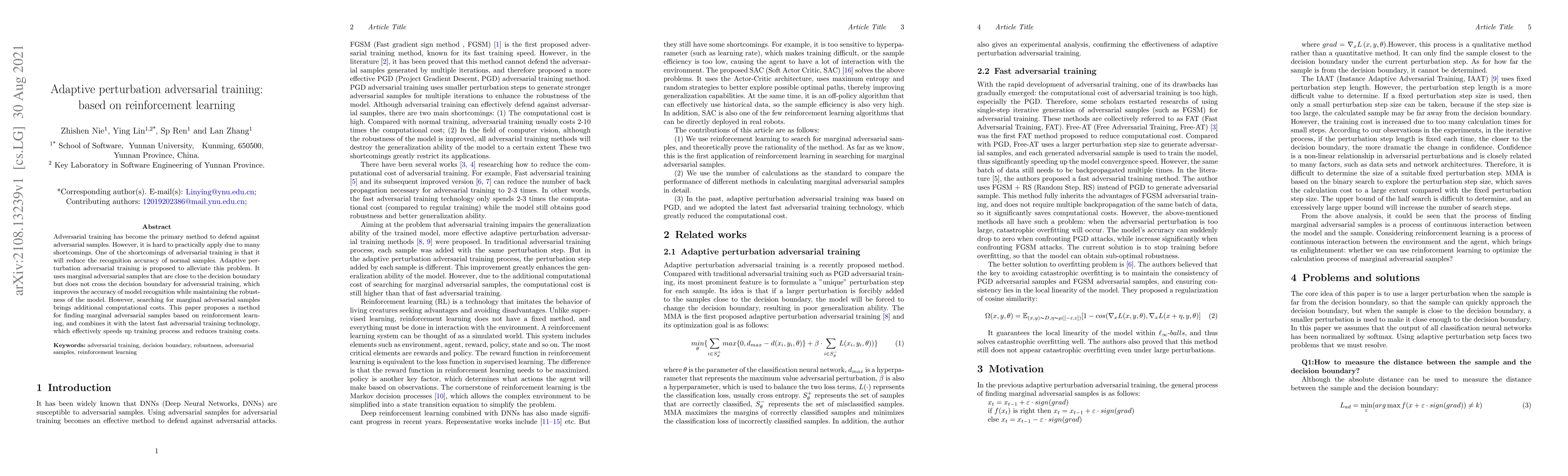 This paper proposes adaptive perturbation adversarial training using reinforcement learning to improve model robustness without sacrificing accuracy on normal samples. It leverages marginal adversarial samples near the decision boundary and employs reinforcement learning to efficiently find these samples, thus speeding up training and reducing costs.