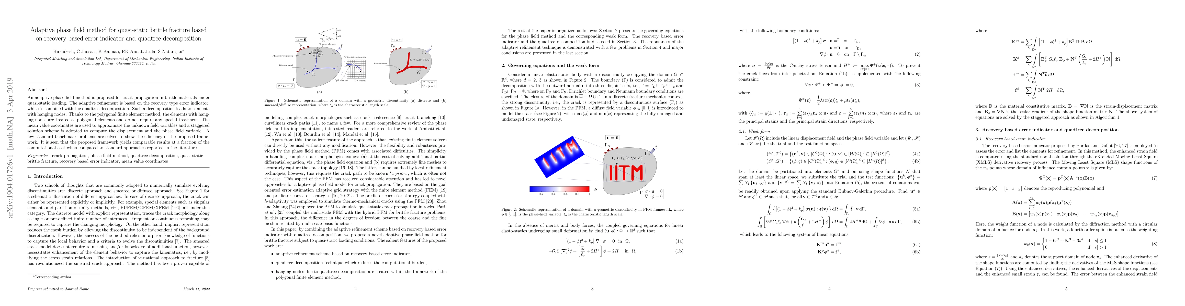 This paper proposes an adaptive phase field method for quasi-static brittle fracture using a recovery-based error indicator and quadtree decomposition. The method efficiently handles elements with hanging nodes via polygonal finite elements and demonstrates comparable accuracy with significantly reduced computational cost.