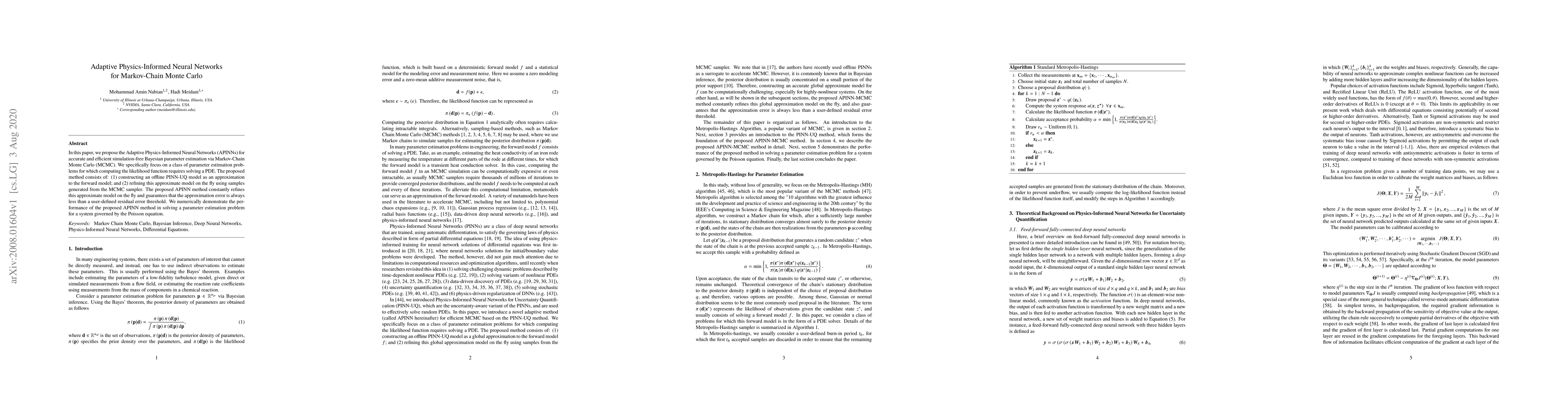 In this paper, we propose the Adaptive Physics-Informed Neural Networks (APINNs) for accurate and efficient simulation-free Bayesian parameter estimation via Markov-Chain Monte Carlo (MCMC). We specifically focus on a class of parameter estimation problems for which computing the likelihood function requires solving a PDE. The proposed method consists of: (1) constructing an offline PINN-UQ model as an approximation to the forward model; and (2) refining this approximate model on the fly using samples generated from the MCMC sampler. The proposed APINN method constantly refines this approximate model on the fly and guarantees that the approximation error is always less than a user-defined residual error threshold. We numerically demonstrate the performance of the proposed APINN method in solving a parameter estimation problem for a system governed by the Poisson equation.