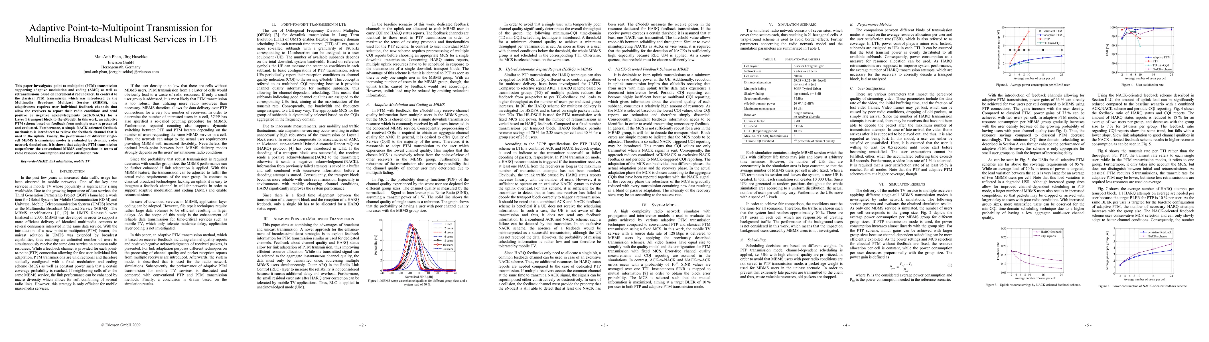 This paper proposes an adaptive point-to-multipoint transmission scheme for LTE multimedia broadcast multicast services, utilizing adaptive modulation and coding with feedback mechanisms to improve performance. Simulation results show that the adaptive approach outperforms traditional methods in resource efficiency and user satisfaction.