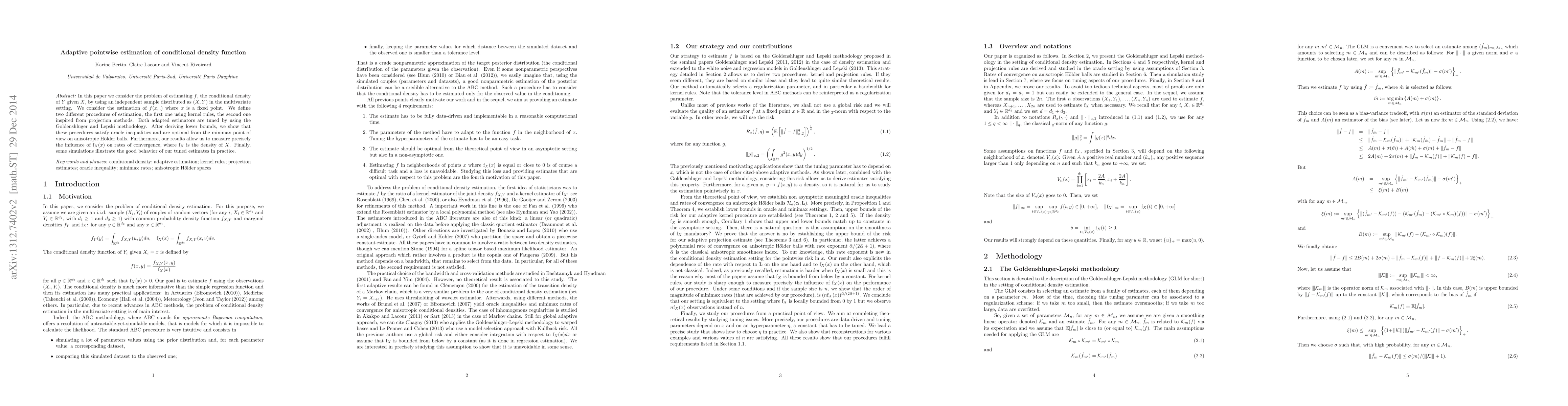 In this paper we consider the problem of estimating $f$, the conditional density of $Y$ given $X$, by using an independent sample distributed as $(X,Y)$ in the multivariate setting. We consider the estimation of $f(x,.)$ where $x$ is a fixed point. We define two different procedures of estimation, the first one using kernel rules, the second one inspired from projection methods. Both adapted estimators are tuned by using the Goldenshluger and Lepski methodology. After deriving lower bounds, we show that these procedures satisfy oracle inequalities and are optimal from the minimax point of view on anisotropic H{\"o}lder balls. Furthermore, our results allow us to measure precisely the influence of $\mathrm{f}\_X(x)$ on rates of convergence, where $\mathrm{f}\_X$ is the density of $X$. Finally, some simulations illustrate the good behavior of our tuned estimates in practice.