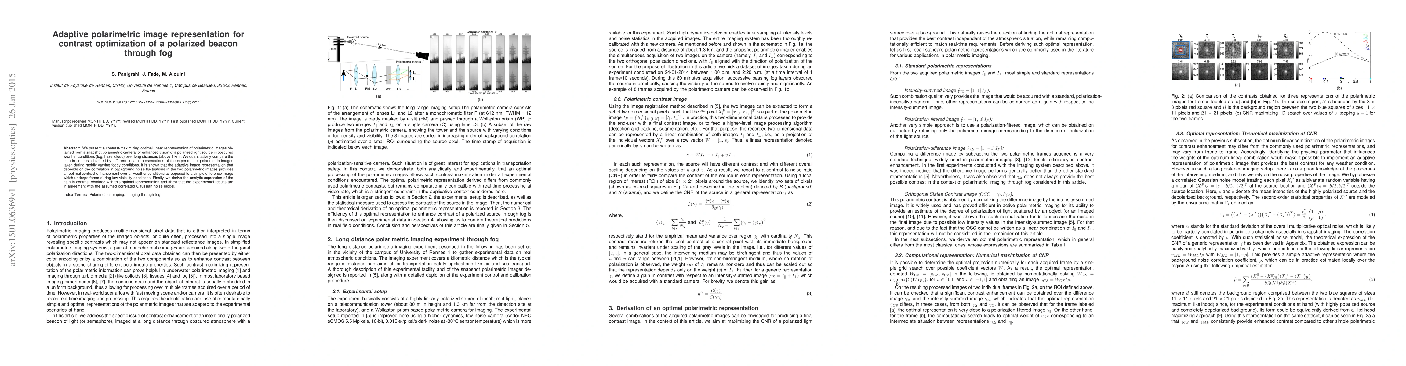 This research introduces an adaptive polarimetric image representation that optimally enhances contrast of polarized light sources in adverse weather conditions like fog, surpassing simple difference images. The method, validated by experiments and theoretical models, offers improved long-distance visibility beyond 1 km.