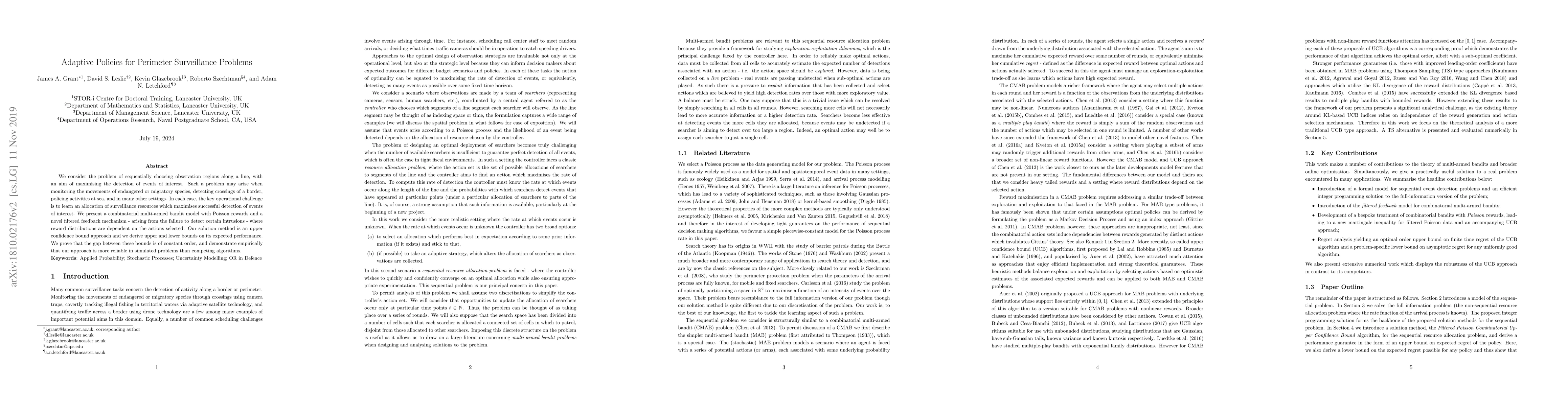 This research introduces a model and methods for adaptive perimeter surveillance, utilizing a combinatorial multi-armed bandit framework with Poisson rewards. It proposes an upper confidence bound solution, proving its performance bounds gap is constant, and demonstrating its superiority over competing algorithms in simulations.