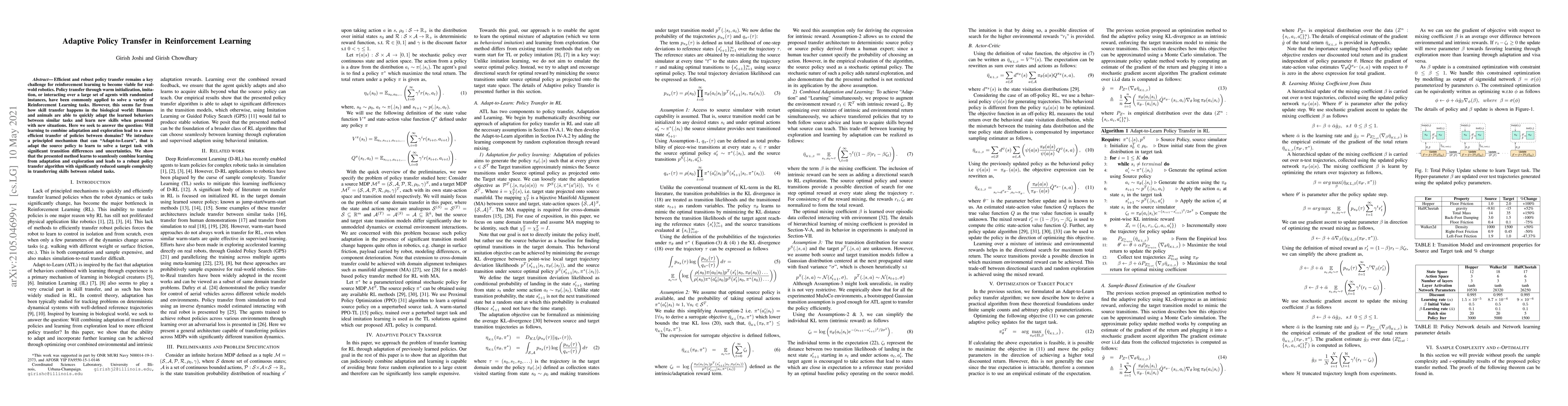 This paper proposes an "Adapt-to-Learn" mechanism for adaptive policy transfer in reinforcement learning, aiming to mimic biological skill transfer. The method combines adaptation and exploration to efficiently transfer policies between domains, significantly reducing sample complexity.
